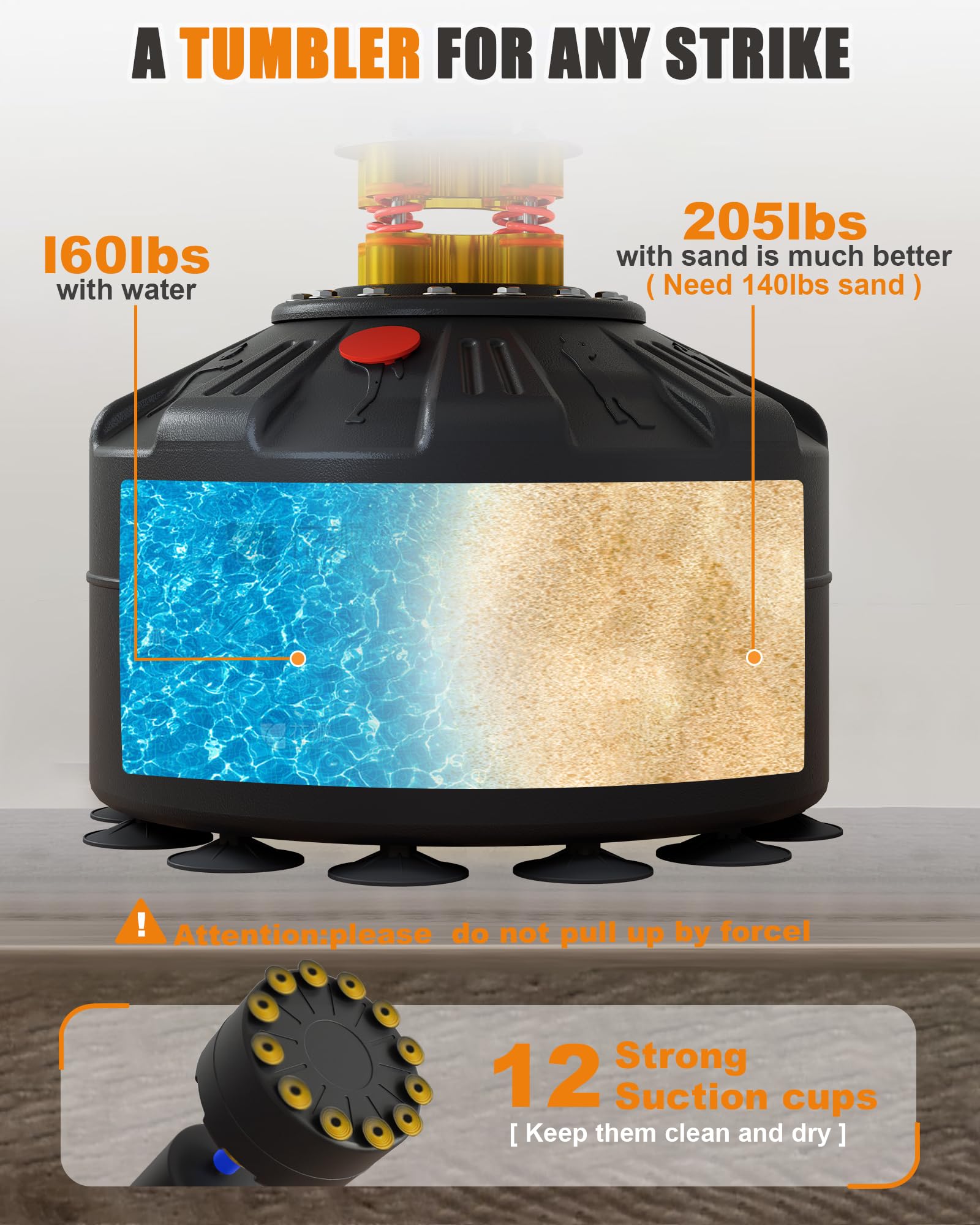 • Stable Base with Suction Cups : Large size and non-deformed removable polypropylene base, can hold 205lbs of sand, it is recommended to fill with sand for more stability than filling with water, placed on a smooth floor so the 12 suction cups can provide strong suction, providing a stable support for the entire boxing bag.
