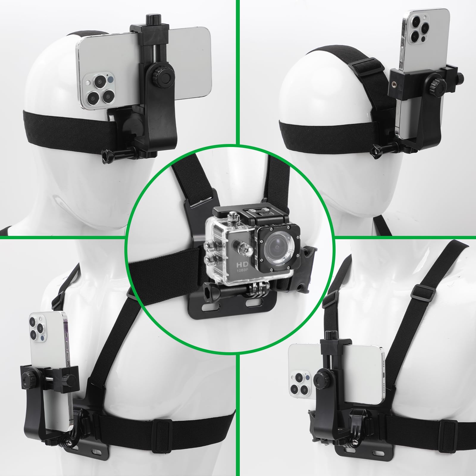 Details: When doing strenuous exercise, please don't use the phone chest and Head strap mount kit for shooting mobile phone video, not suitable for running and jumping!!!