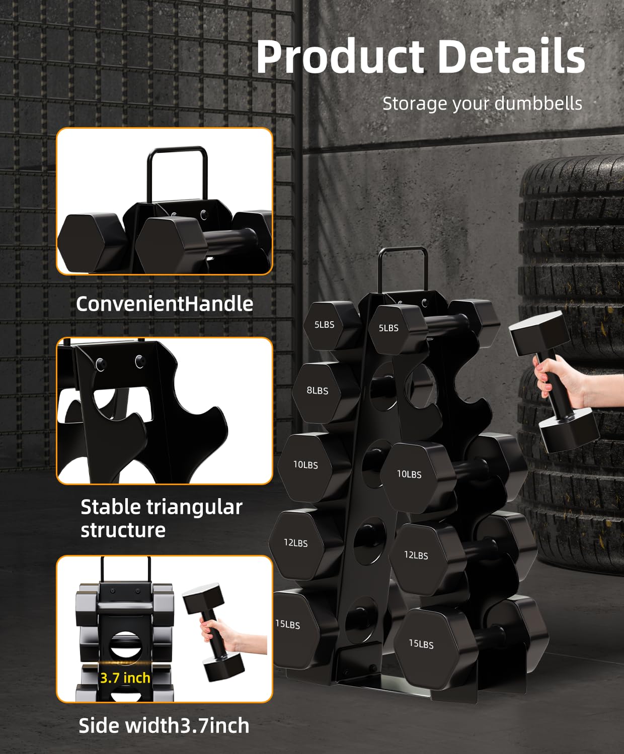 • 【Stable Triangular Design】This dumbbell rack uses a stable triangular design, which is made of 2mm commercial-grade steel, fitted with widen base, making it extremely stable and durable; It can hold up to 180 pounds and does not wobble when taking in or taking out dumbbells; The dumbbell rack is suitable for 5-15 pound dumbbells