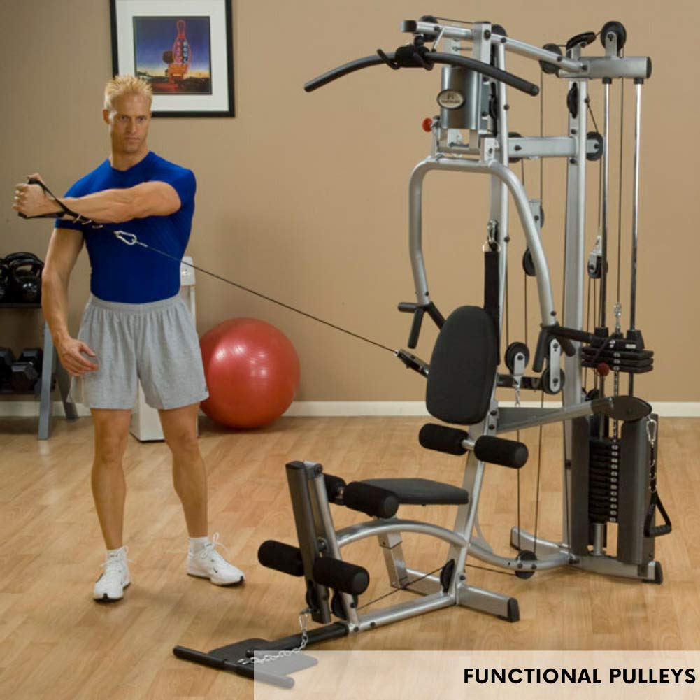 Enjoy comprehensive full-body workouts at home with the Powerline by Body-Solid Home Gym (P2X). This home workout machine is cleverly engineered to offer free-range movements and exceptional range of motion for users of any size. By combining an ergonomically correct press arm and a functional training arm, this home gym puts you in the unique position to have the best of both worlds: traditional exercises as well as functional training in a single, compact machine. This home workout equipment is biomechanically engineered for full range of motion with low, mid, and high pulleys that swivel to adjust a variety of different exercises for smooth, consistent resistance. The multi-press arms are biomechanically designed for maximum chest concentration and muscle development, with comfortable, multi-position handgrips that let you focus on distinct areas of the chest and triceps. Switch between multi-press arm exercises, pec flys, converging presses, lat pulldowns, ab crunches, seated rows, leg extensions, and leg curls for a full-body workout. When assembled, the Powerline by Body-Solid Home Gym measures 71 by 49 by 83 inches (L x W x H) and weighs 385 pounds. The machine is powered by a 160-pound alloy weight stack, and can be upgraded to 210 pounds with the optional SP50 weight stack (sold separately). You can also expand the machine's functionality with the optional Leg Press (PLPX) attachment. This home gym is backed by the Powerline 10-Year In-Home , which covers the frame for 10 years and all other parts for one year.