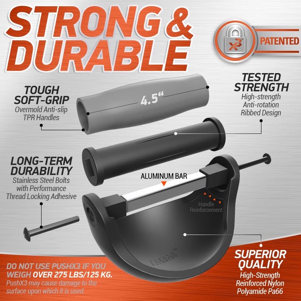 • πŸ‘πŸΌ [STRENGTH & DURABILITY TESTED]: PushX3 has been rigorously tress tested and can accommodate maximum weight without cracking or breaking.