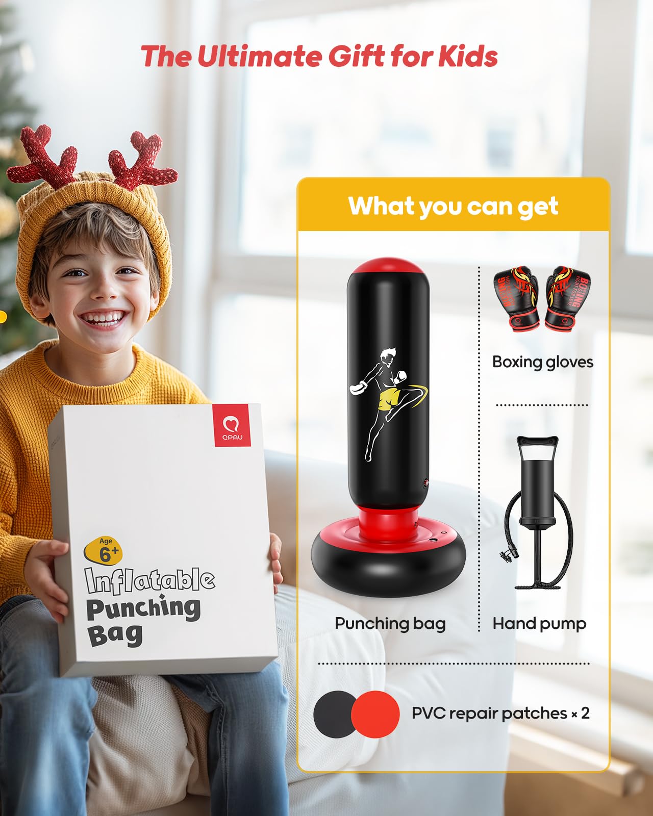 QPAU Kids Punching Bag Toy with Boxing Gloves, 66 Inch Larger Stable Kids Inflatable Boxing Bag Set, Gifts for Boys & Girls Age 6-12, for Practicing Karate, Taekwondo, MMA (Black&Red)
