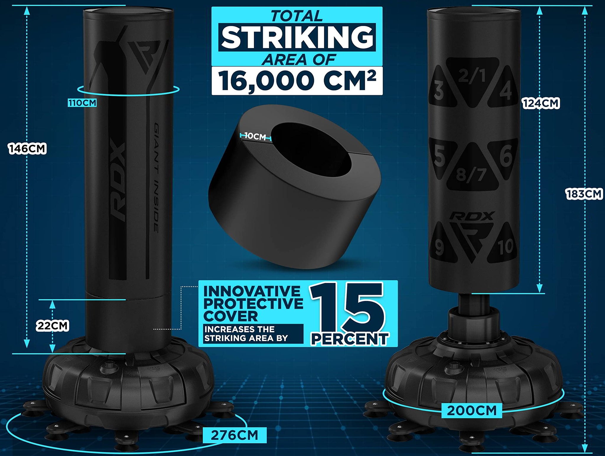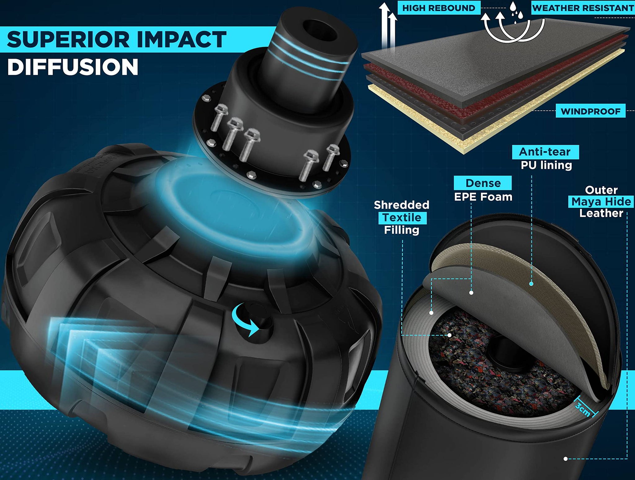 • GIGANTIC XXL HEAVY-DUTY PUNCH BAG – Looking for a heavyweight opponent in a punching bag? RDX RONIN series free standing punching bag for adults provides the optimal dimensions you’re looking for. The Kickboxing bags feature a striking surface that is made of Maya Hide leather infused with an inner anti-rip PU material lining that ensures enhanced endurance making it ideal for all sports training, including boxing, kickboxing, MMA, and more.