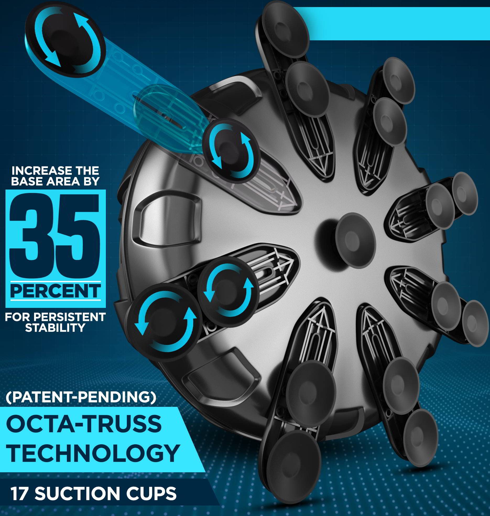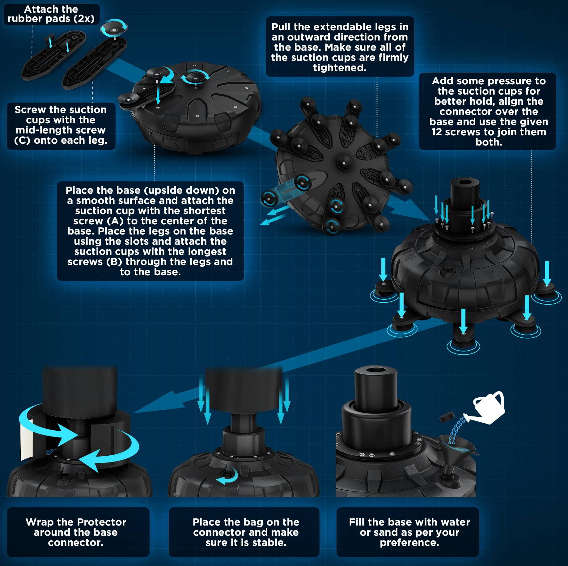 • PATENT PENDING OCTA TRUSS SUCTION BASE– The standing punching bag offers a revolutionary wide octa truss (patent pending) base with 8 extended legs that increase the for persistent stability. Each leg features double suction cups and dual rubber pieces for enhanced support, and firmness. The central suction cup of the base along the 16 suction cups for the legs are supposed to be pressed down against a smooth surface to keep the base and legs affixed on the floor.