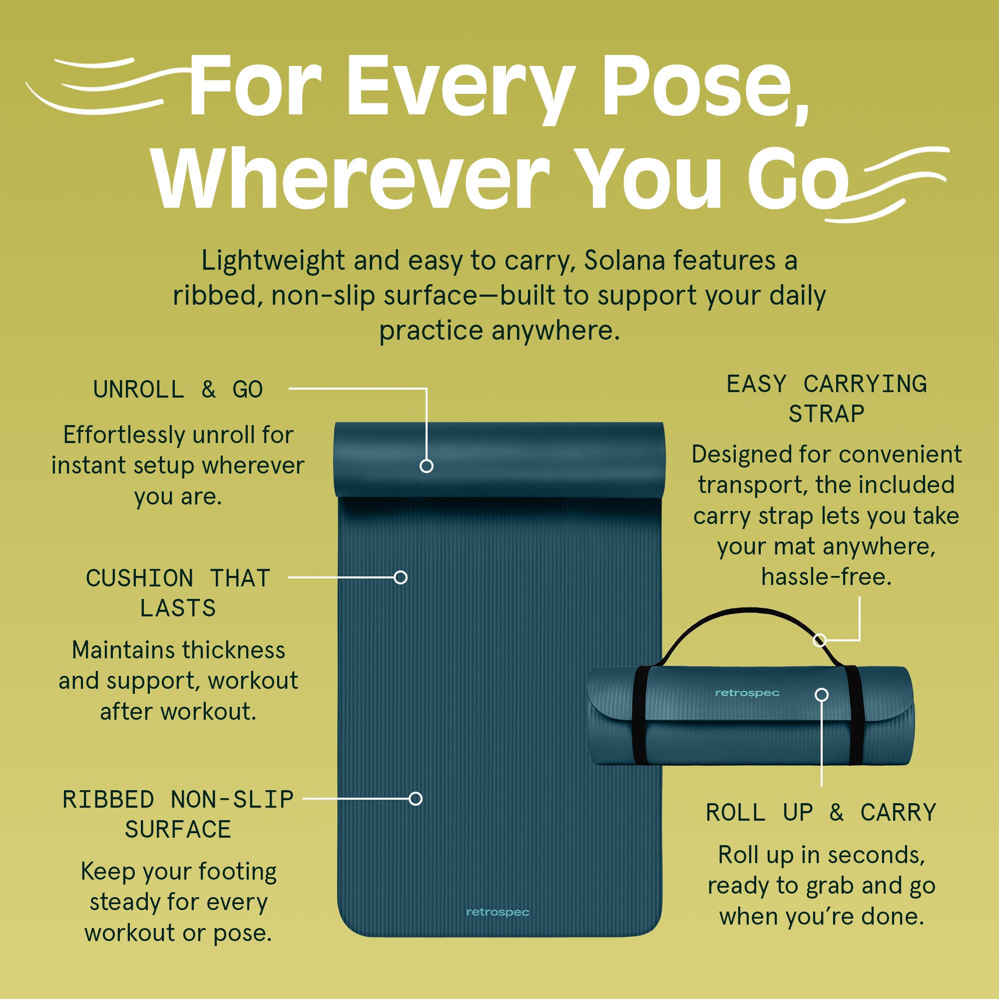 - DURABLE & PORTABLE: Solana's thick, durable material allows for everyday use, regardless of the intensity of your exercise. Solana comes equipped with a nylon carrying strap so you can easily transport it from your home practice to studio salutations.