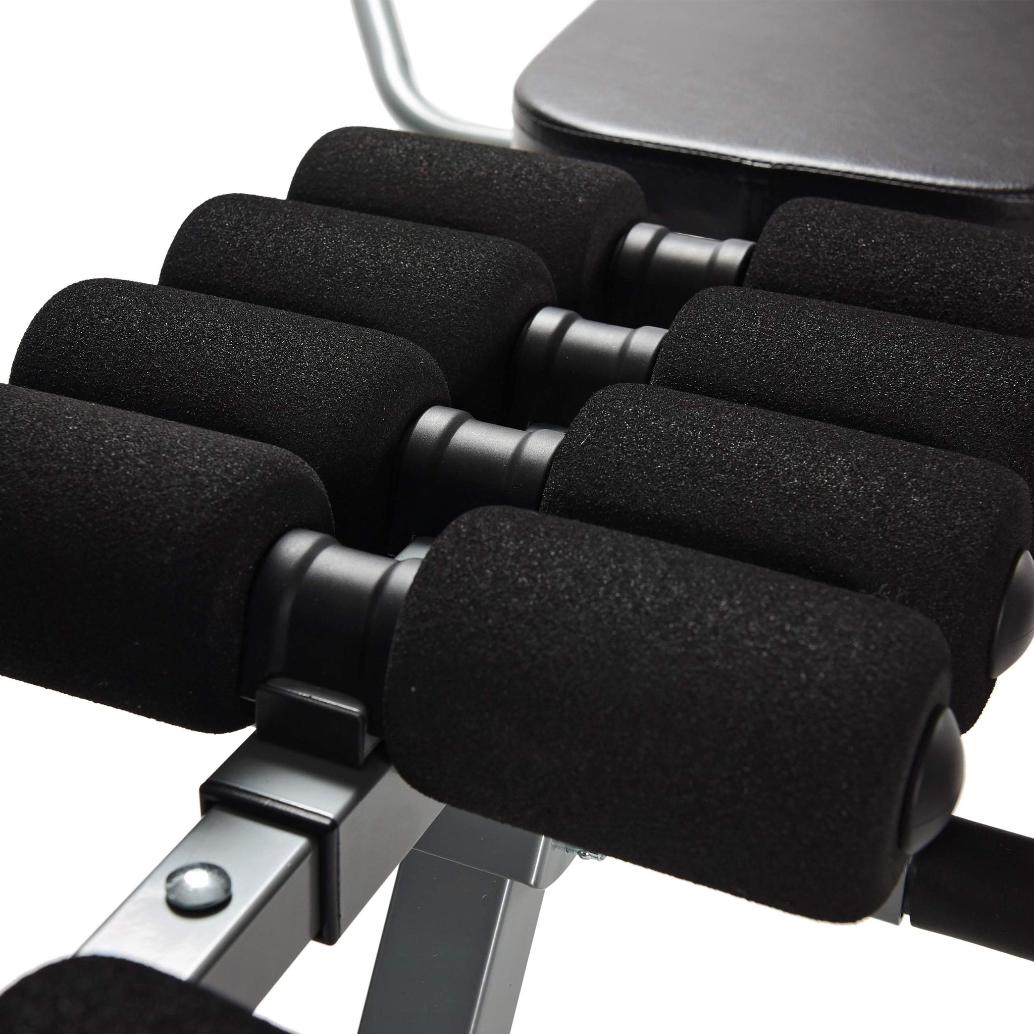 - EXTENDED COMFORT: Includes 8 padded foam rollers for a relaxing massage on tight lower back muscles. The head and neck pillow keeps your head in an ideal position. Ergonomic handlebars and padded ankle, leg and arm rests ensure gentle relaxation for the entire body during stretching.