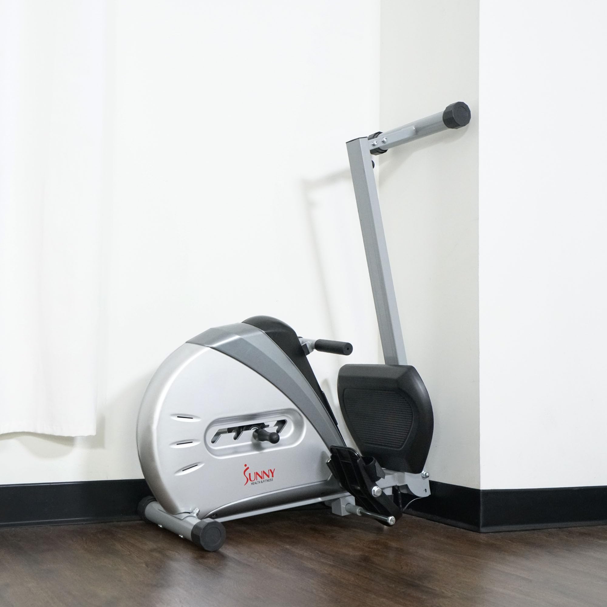 Details: The Sunny Health & Fitness SF-RW5606 Elastic Cord Rowing Machine provides an outstanding way to increase fitness by burning calories and building muscle in a safe, low-impact way. Made of top-grade steel, this ultra-smooth and quiet rower features an elastic cord resistance with 4 levels of adjustable tension which makes it the perfect addition to your home gym. It comes equipped with large any-slip pedals with straps and an easy-to-read LCD monitor which displays Time, Calories burned, Count, Total Count, Count per minute, and Scan. Featuring the option to fold; the Sunny Health & Fitness Elastic Cord Rowing machine is very portable and can easily be stored away. Maximum user weight 220 lb.