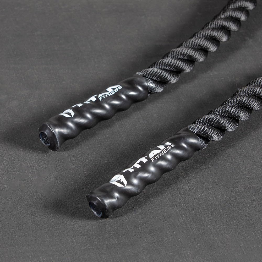 • DIMENSIONS: Titan Battle rope measures at 40 feet with a 1.5-in diameter. The handles have an extra coating to prevent the rope from fraying. Which will greatly increase the life of the battle rope and allow it to be used outdoors.