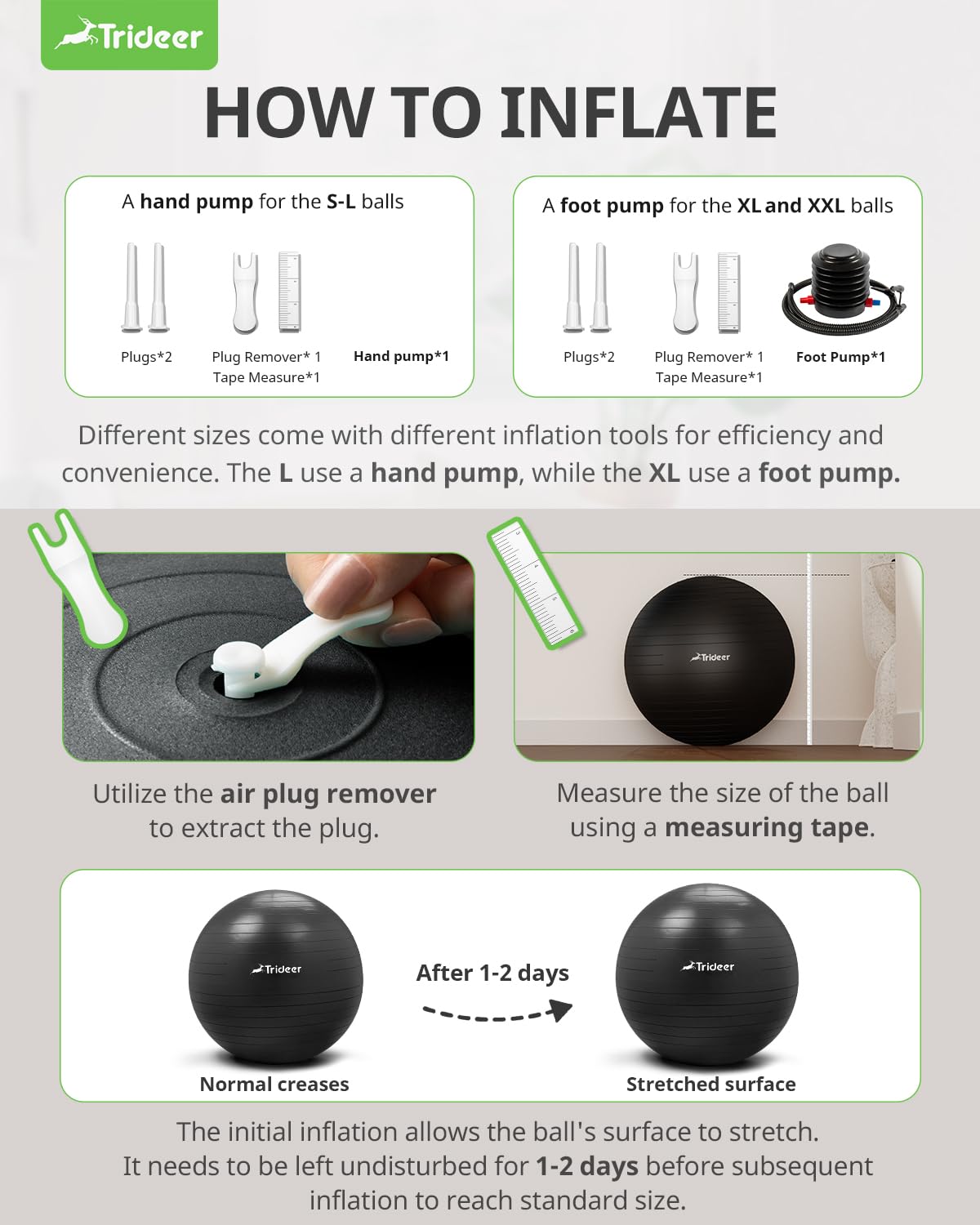 • 【Inflation Instructions】- Inflate the ball to about 80% of the recommended size firstly; leave on for 1-2 days, then inflate to the recommended size. Inflate the ring base in the same way as for the ball; only 30 to 40 pumps to reach perfect condition