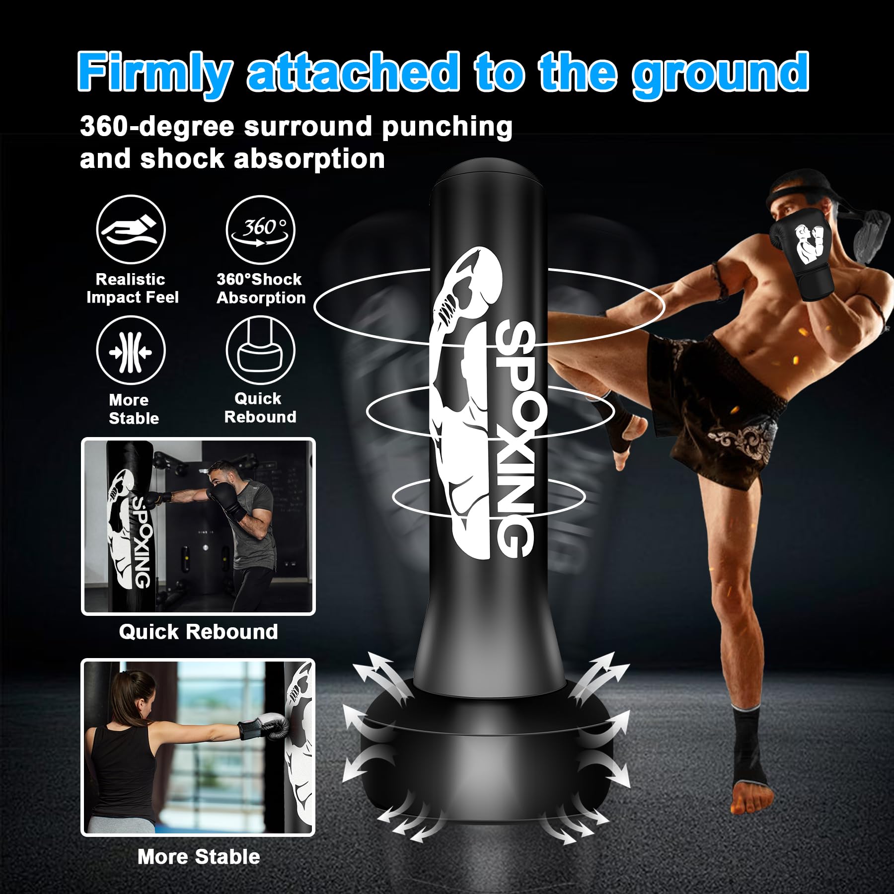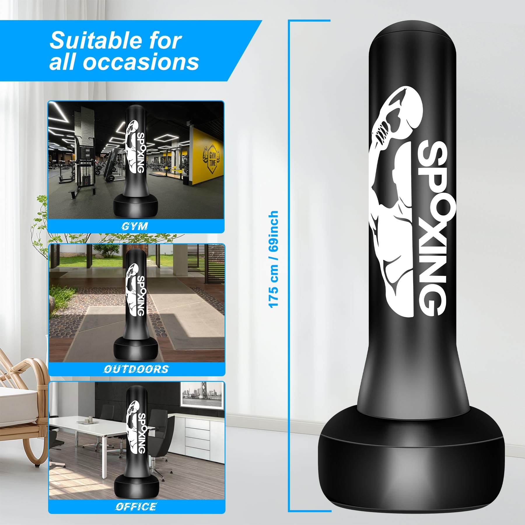 • Stable Large Base Boxing Punching Bag: The base made of thickened 0.5MM PVC material can stably support up to 80 kg of weight and can be filled with 180 pounds of water or 200 pounds of sand. Before using this sandbag, make sure the base is filled with water/sand and inflated with an air pump. You can choose a single material or a mixture of the two to enhance stability. Sand is a good choice for improving stability