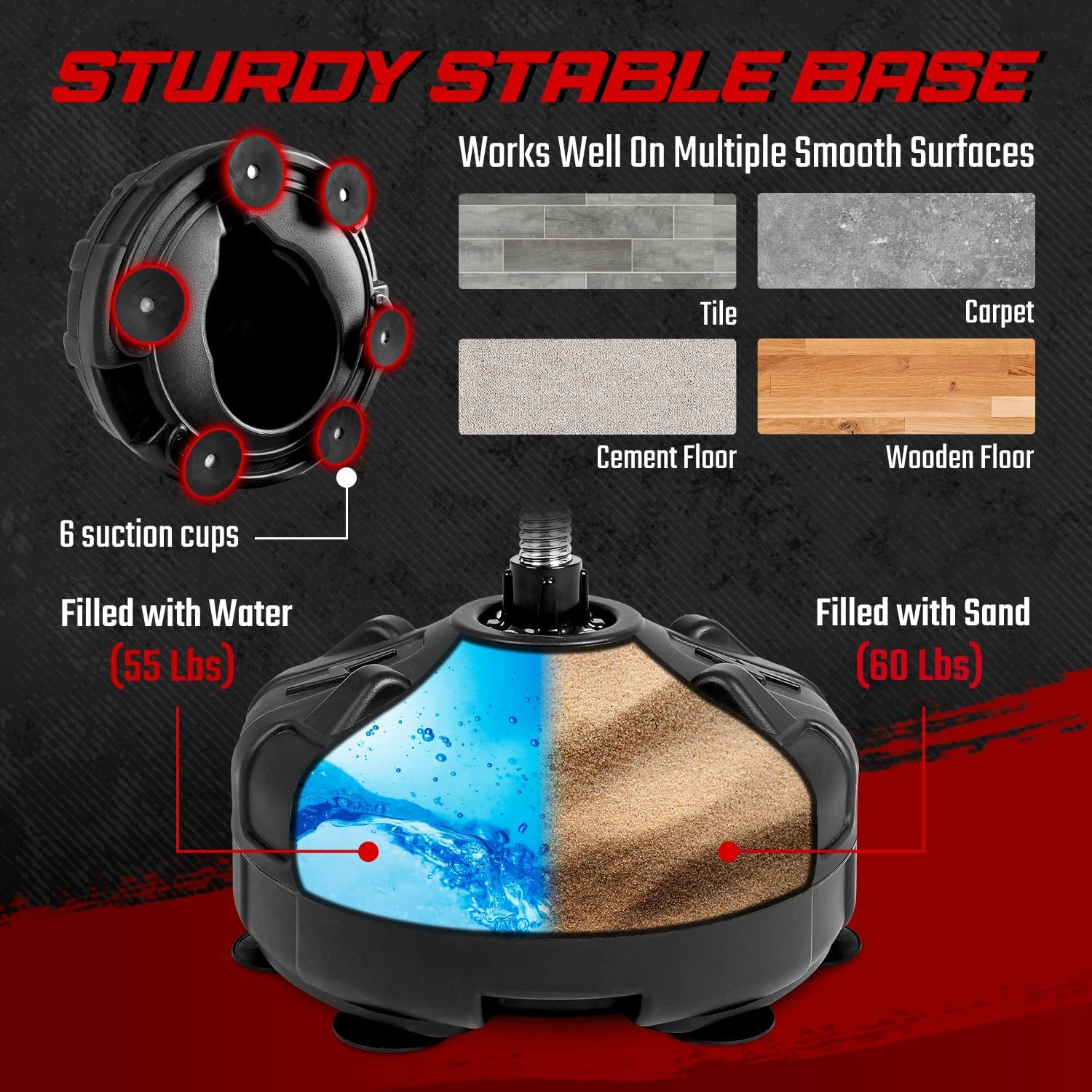 • Durable And Stable Large Base: 6 suction cups design ensures stable and suitable for various surfaces like tiled, wooden, cement floor, carpet. Base is filled by water and sand for max stability, up to 55 lbs, 60 lbs respectively