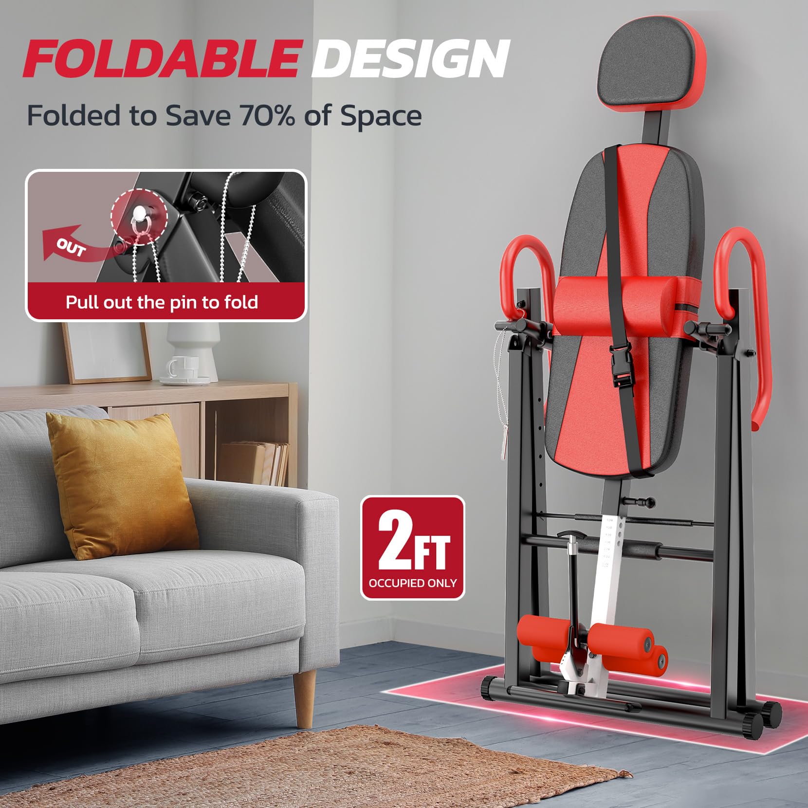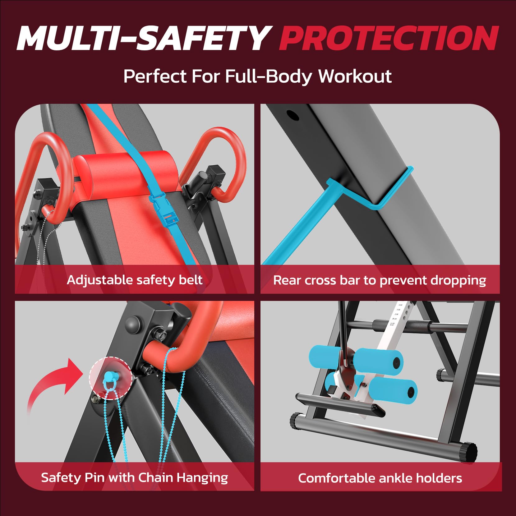 • Adjustable Inversion Table: 6 Angle position adjustable rear cross bar for easy inversion angle adjustment eliminates the typical strap system, and the safety belt are also adjustable, in order to accommodate more users 4ft-10in to 6ft-6in in height.