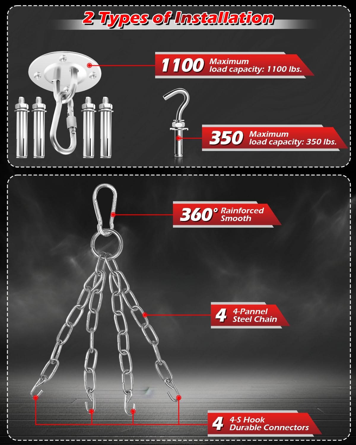 • Heavy Duty Hanger Accessories Set: Punching bag chain is made of stainless steel, permanent rust-proof, safety, environmental protection, very suitable for hanging heavy bags. The round hanging hanger is installed with 4 expansion bolts, is very strong and safe, and can bear up to 1100 lbs! Hang up boxing bag and start you boxing training