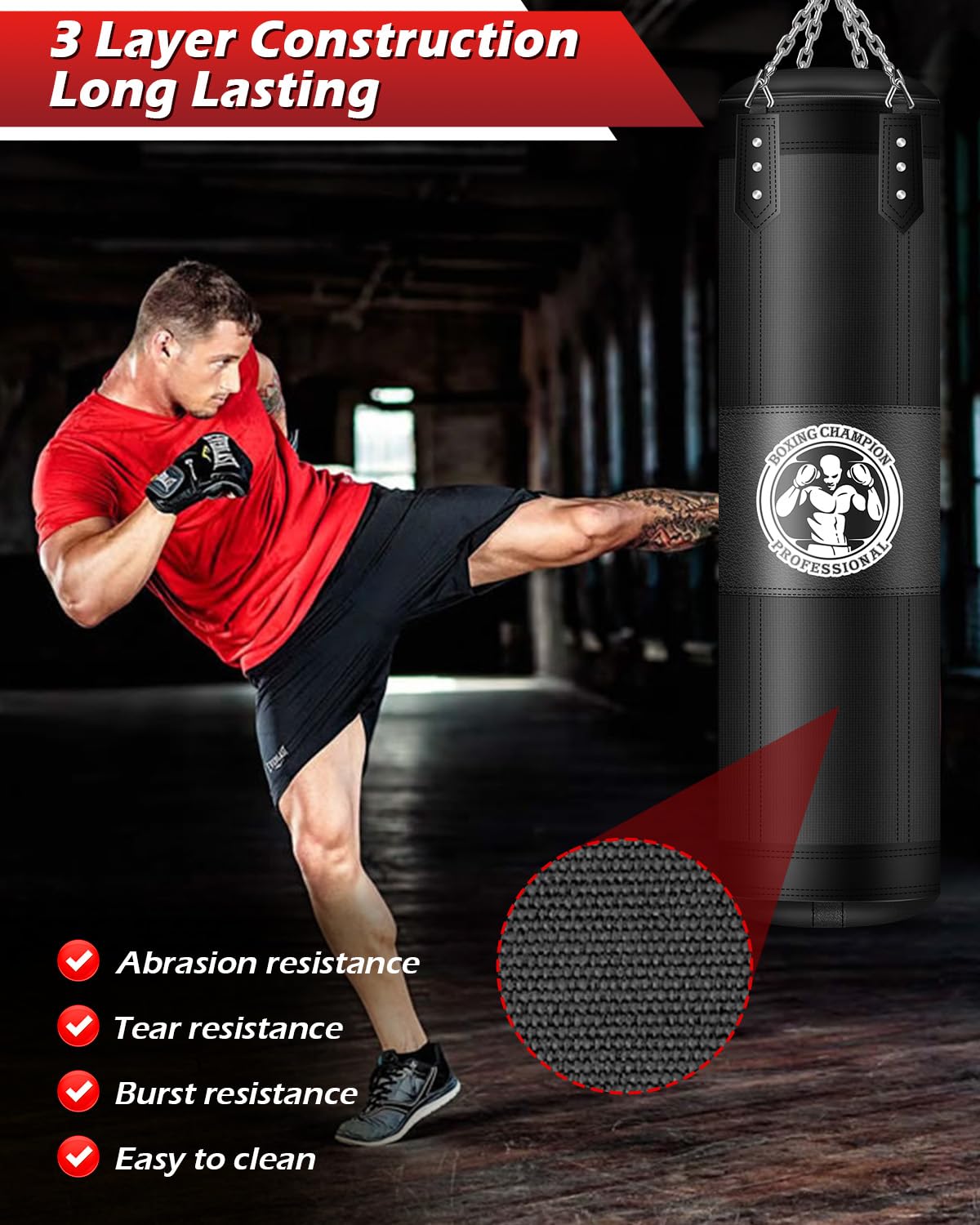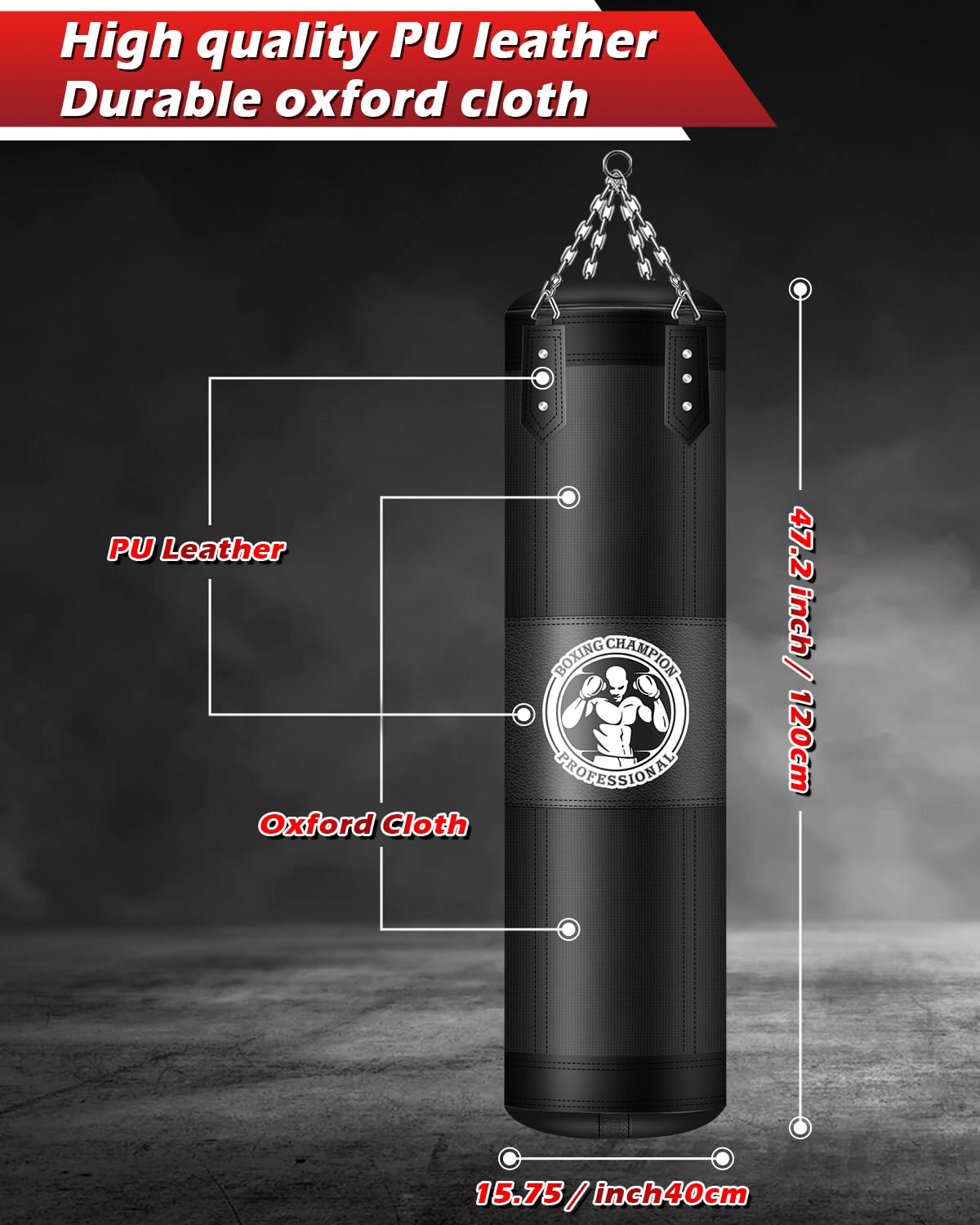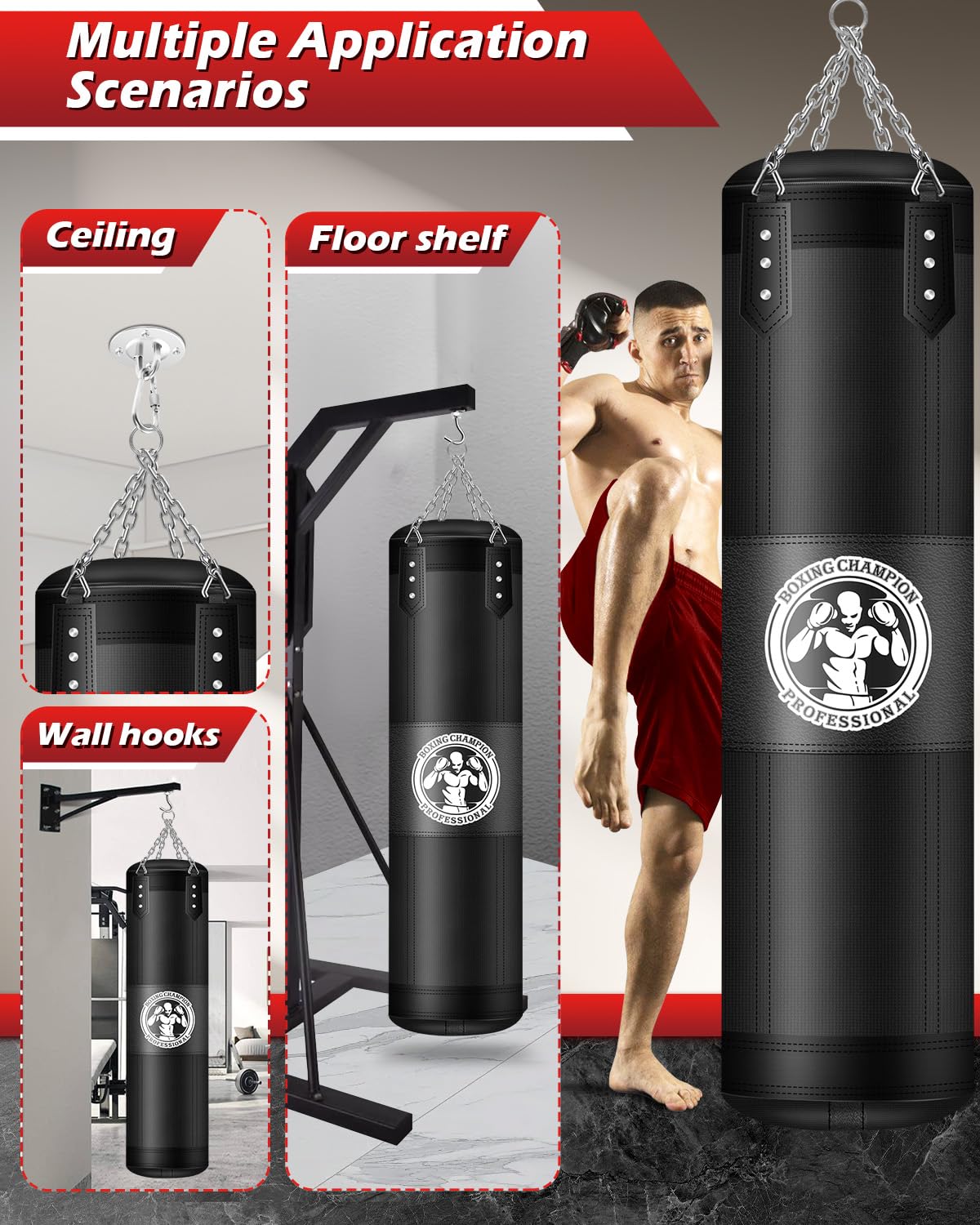 • Super Value Boxing Training Equipment Set: The boxing set includes: 4ft punching bag(unfilled), boxing hand wraps, round hanging hanger, expansion hook, 360°rotation hanging chain, 4 expansion bolt, 2 x connecting carabiner