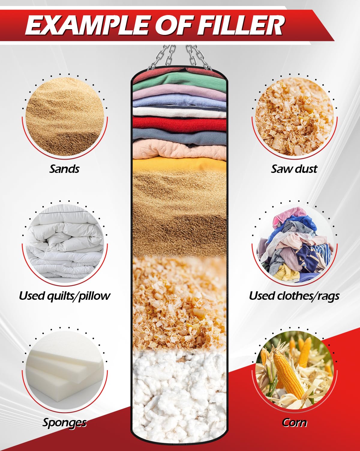 • Please Note: This punching bag for adults is unfilled. You can use sawdust, sand, old clothes, sponge, quilt, shredded cotton fabric, soybean, corn, cotton and other fillers. But please do not only fill sand, filling preferably not more than 50 pounds