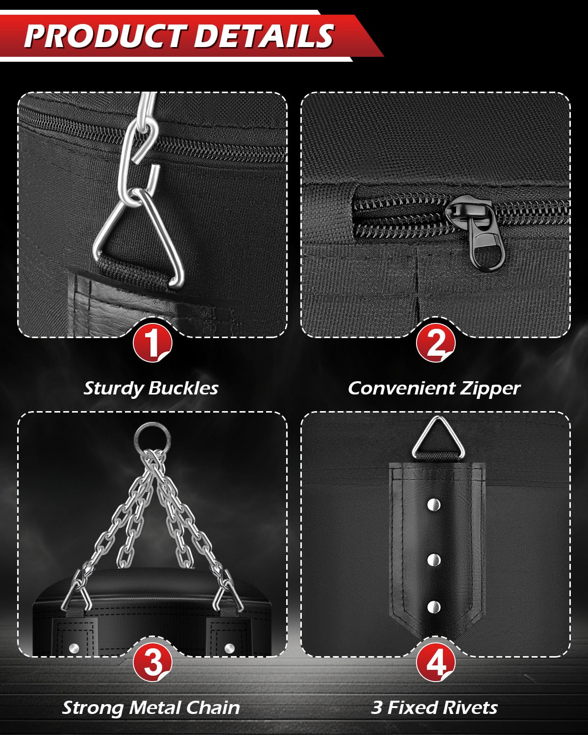 • Stainless Steel 360° Swivel: Heavy punching bag for adults is equipped with 360° rotating hanger, 360° rotation to ensure that the heavy sandbags rotate flexibly and have a strong load-bearing capacity, to fully ensure your safety and stability in the process of use