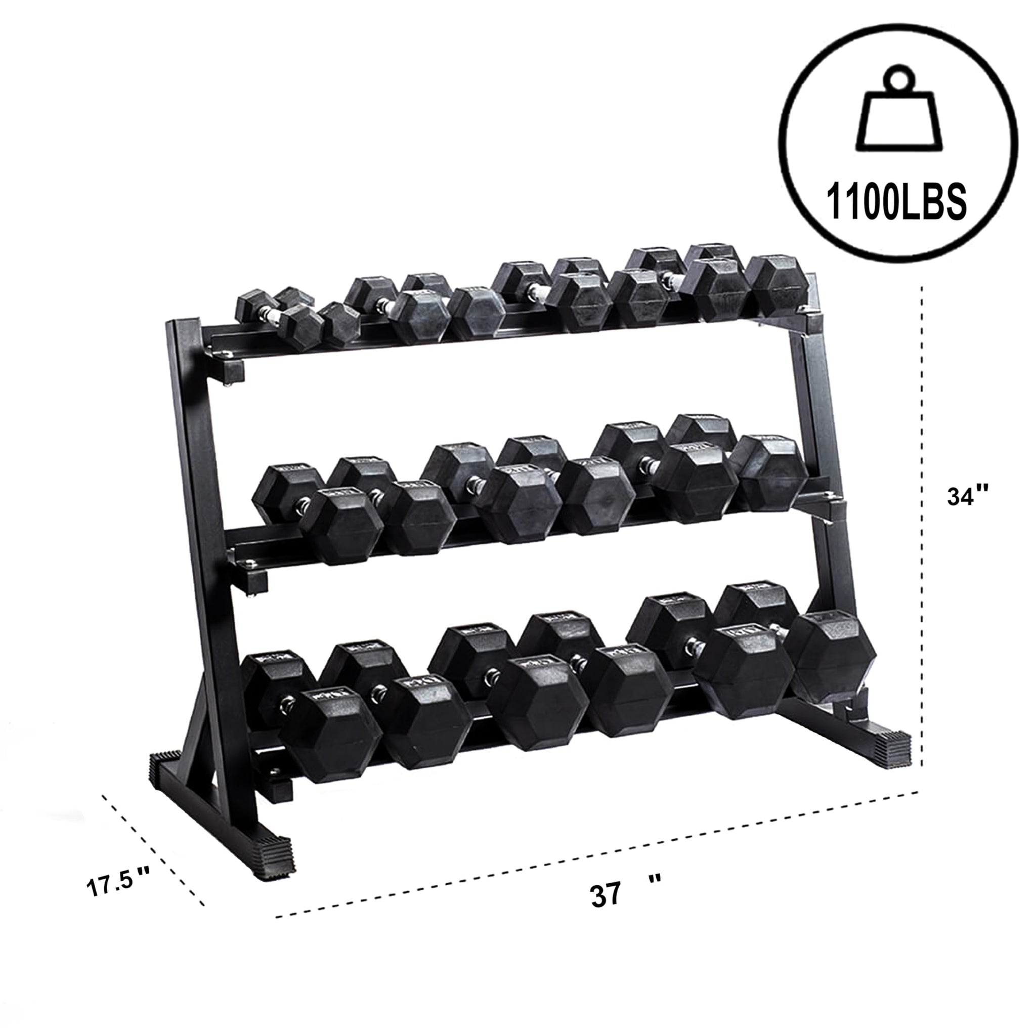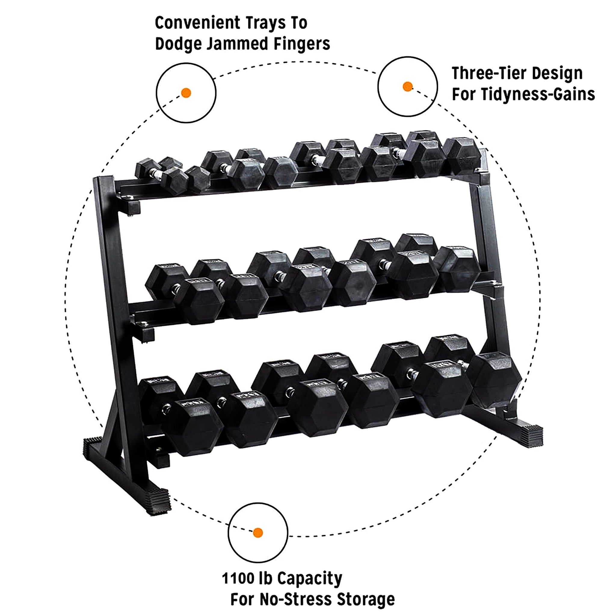 • ✎[Space-saving design]:Gives you a same utility of a 2-tier dumbbell rack with a much smaller footprint while not compromising the storage capacity. The 3x 1.2m trays space for more number of dumbbells than the standard 2-tier designs.
