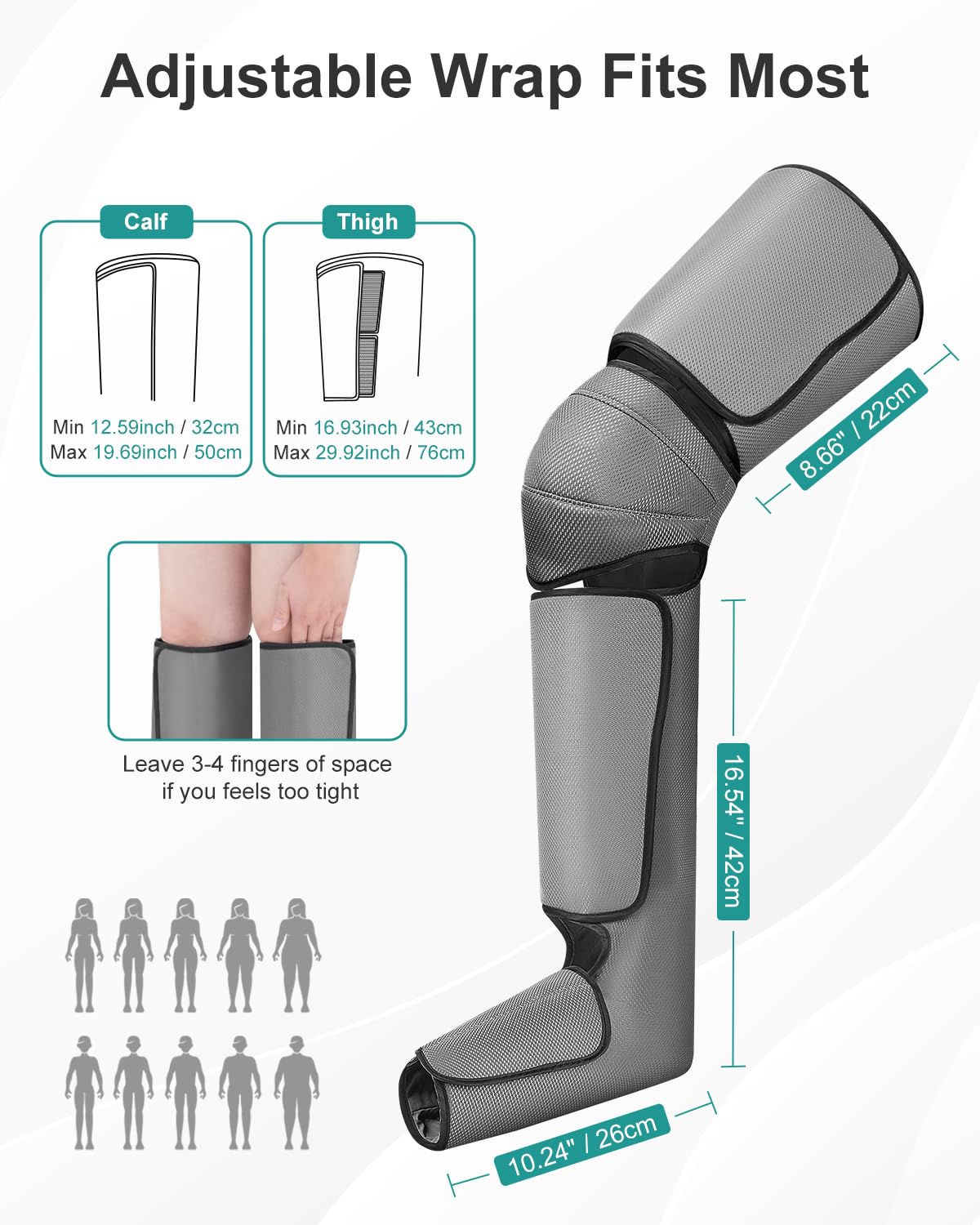 - ADJUSTABLE STRAPS FITS MOST SIZE: You can easily change the size of the foot and leg massager with adjustable Velcro straps. The calf circumference is 12.59-19.69 inches, and the thigh circumference is 16.93-29.92 inches. It can be adjusted according to your needs. We recommended leaving room for Insert the space between 3-4 fingers so as not to compress too tightly.