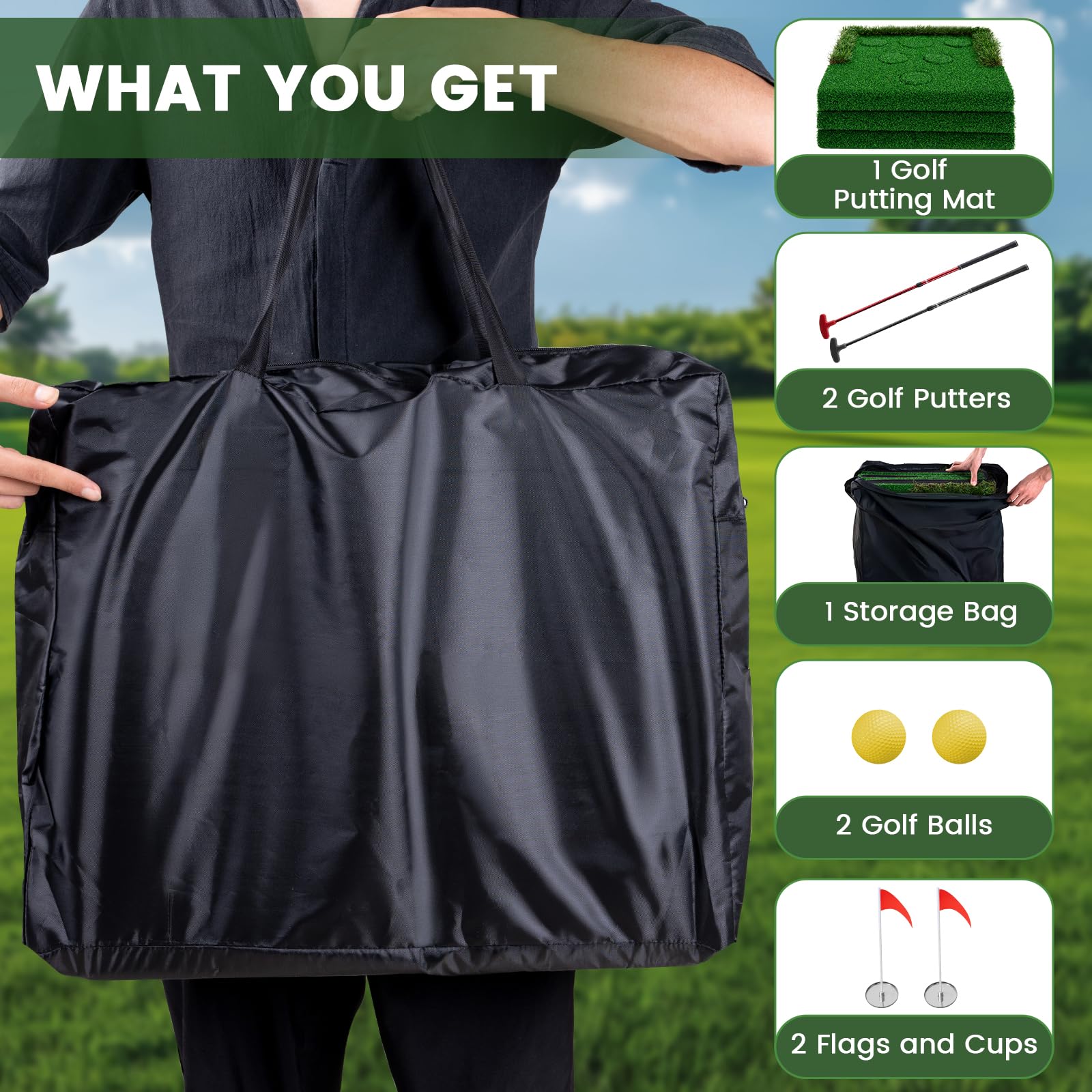 Golf Pong Mat Game Set Green Mat, Golf Putting Mat with 2 Adjustable Golf Putters, 6 Golf Balls,12 Golf Hole Covers