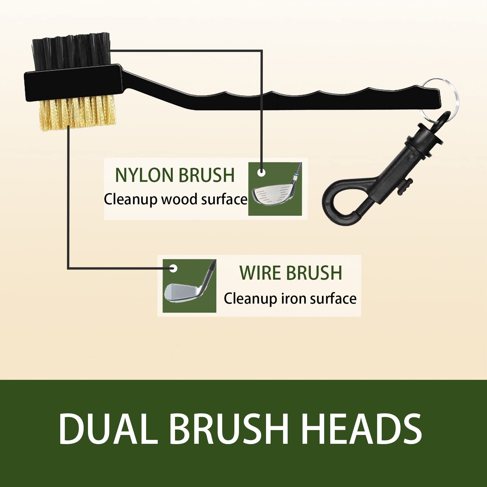 - Dual Brush Heads: Brass bristles for quick and efficient cleaning of irons while on the fairway. Nylon bristles for easy cleaning of woods and shoe spikes/cleats.