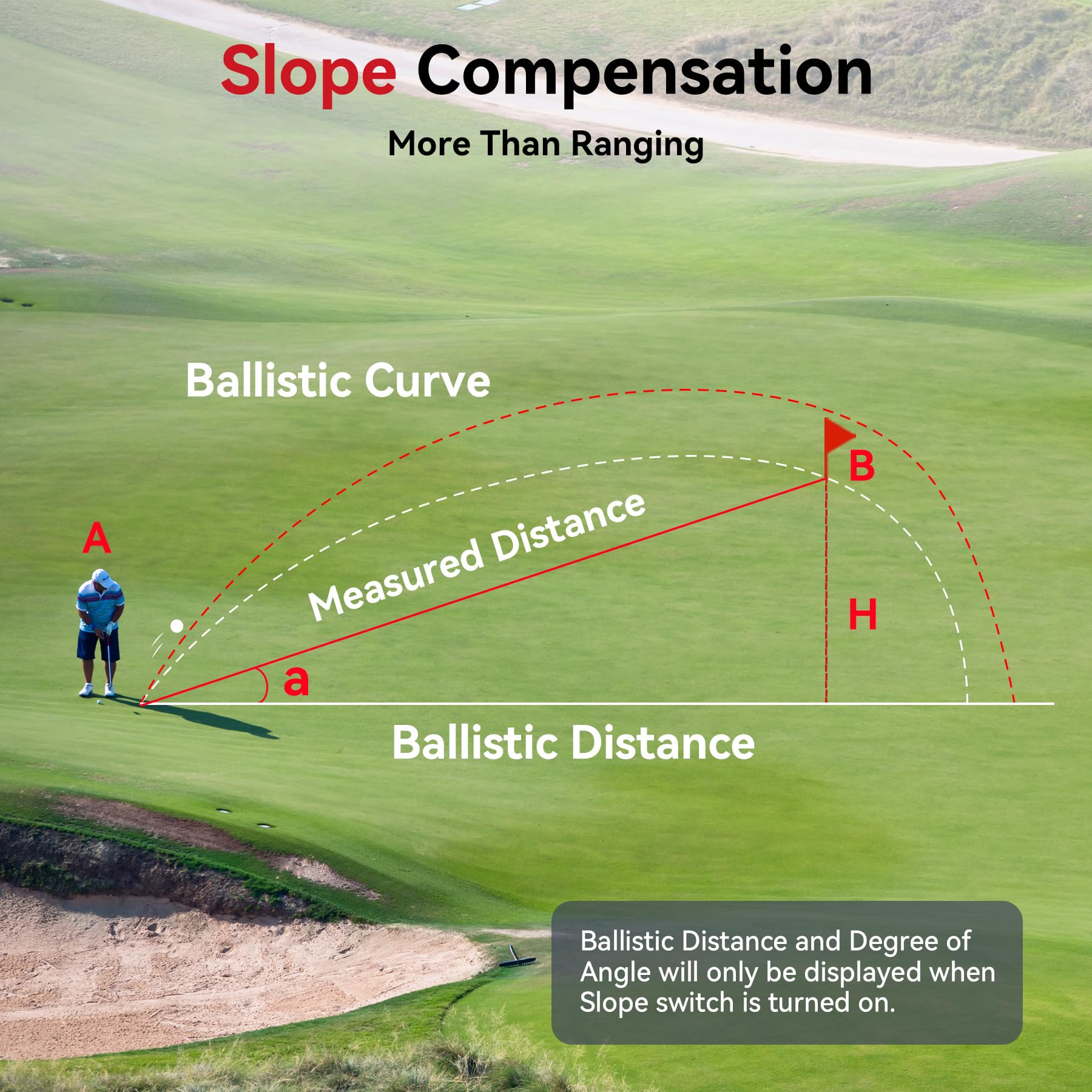 • 6 Measurement Modes: Golf laser rangefinder with a brief press of the button, you can change between measuring modes on a golf laser rangefinder. You can choose from six different modes: slope compensation, golf flag locking, horizontal and height ranging, speed measuring, and continuous scan measurement