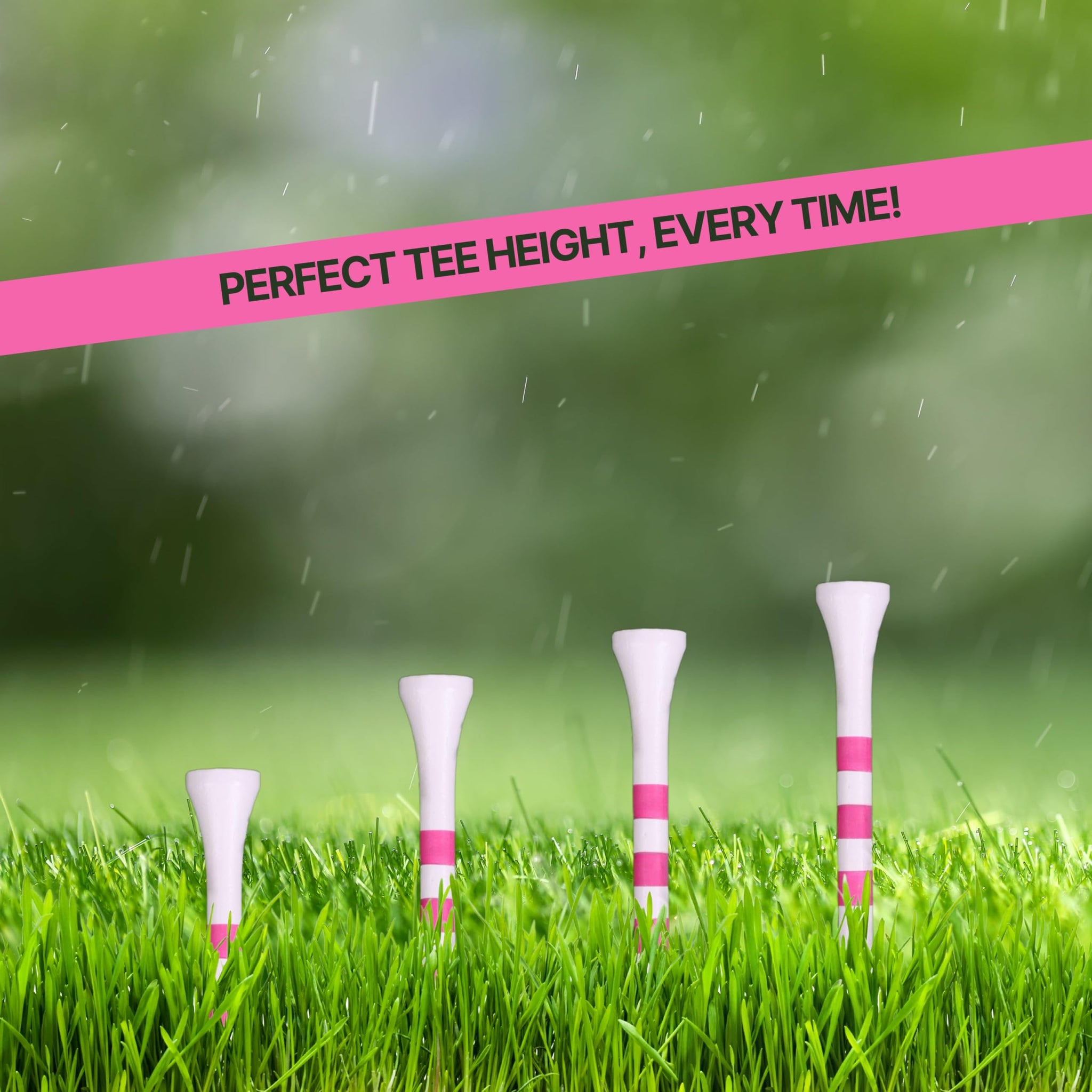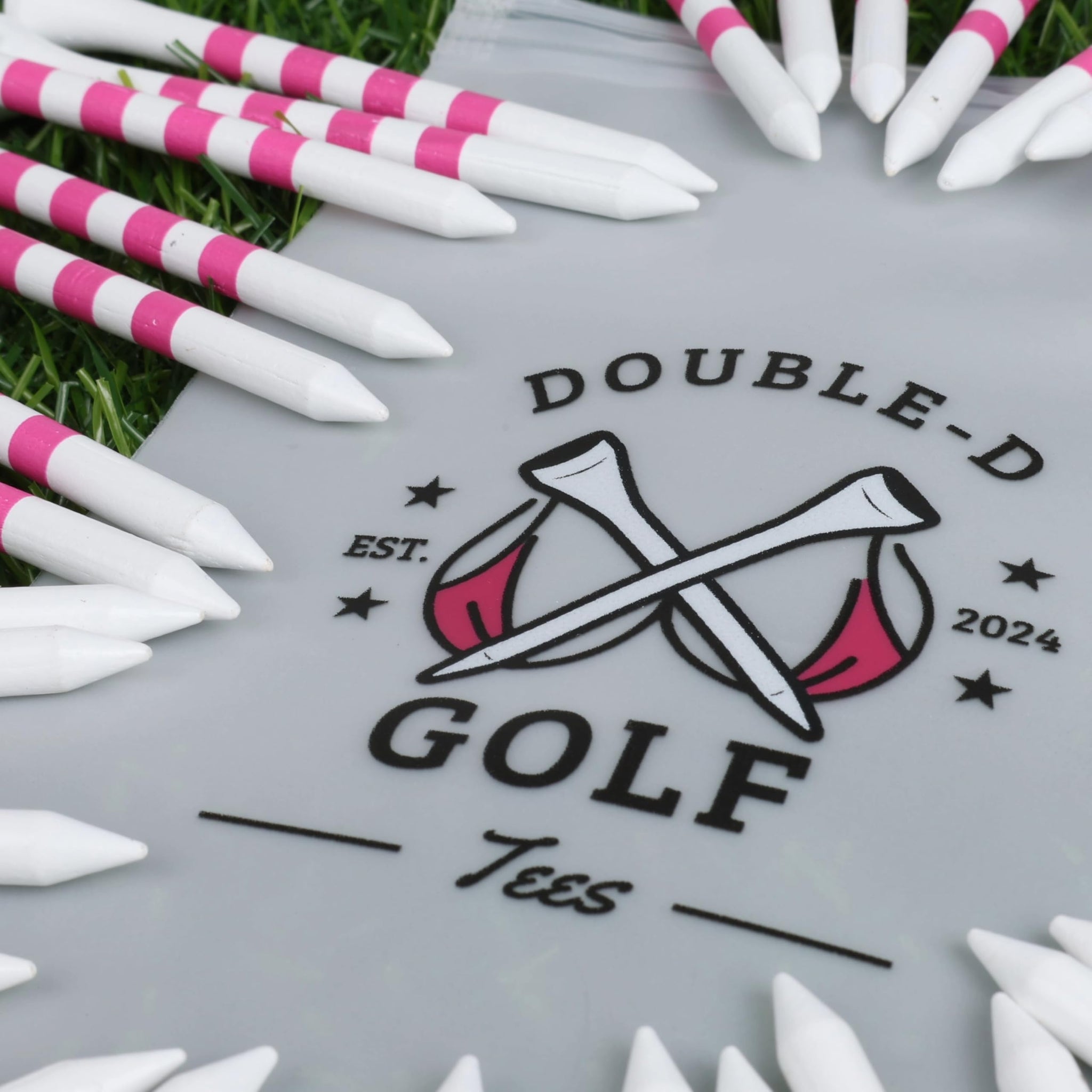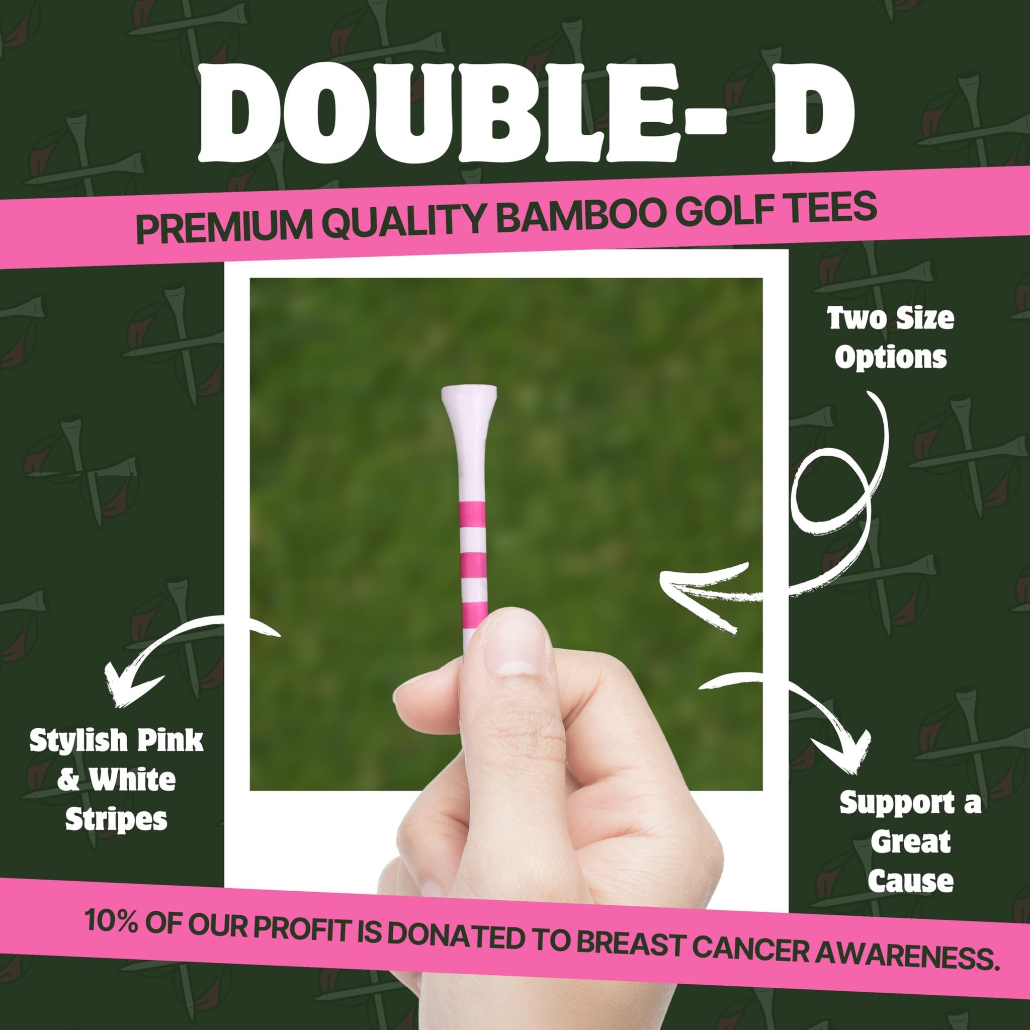 Details: Elevate your golf game while supporting a great cause with Double-D Golf Bamboo Tees. Options for both 100 count 2 3/4” tees and 80 count 3 1/4” tees, designed for both performance and style. Featuring eye-catching pink and white stripes, these eco-friendly bamboo tees not only look great but are also strong and sustainable. At Double-D Golf, we are proud to give back—10% of our profit is donated to breast cancer awareness. Your purchase makes a difference! Play with purpose. Choose Double-D Golf.