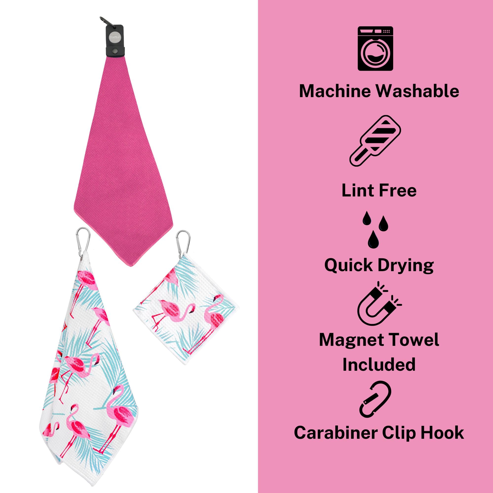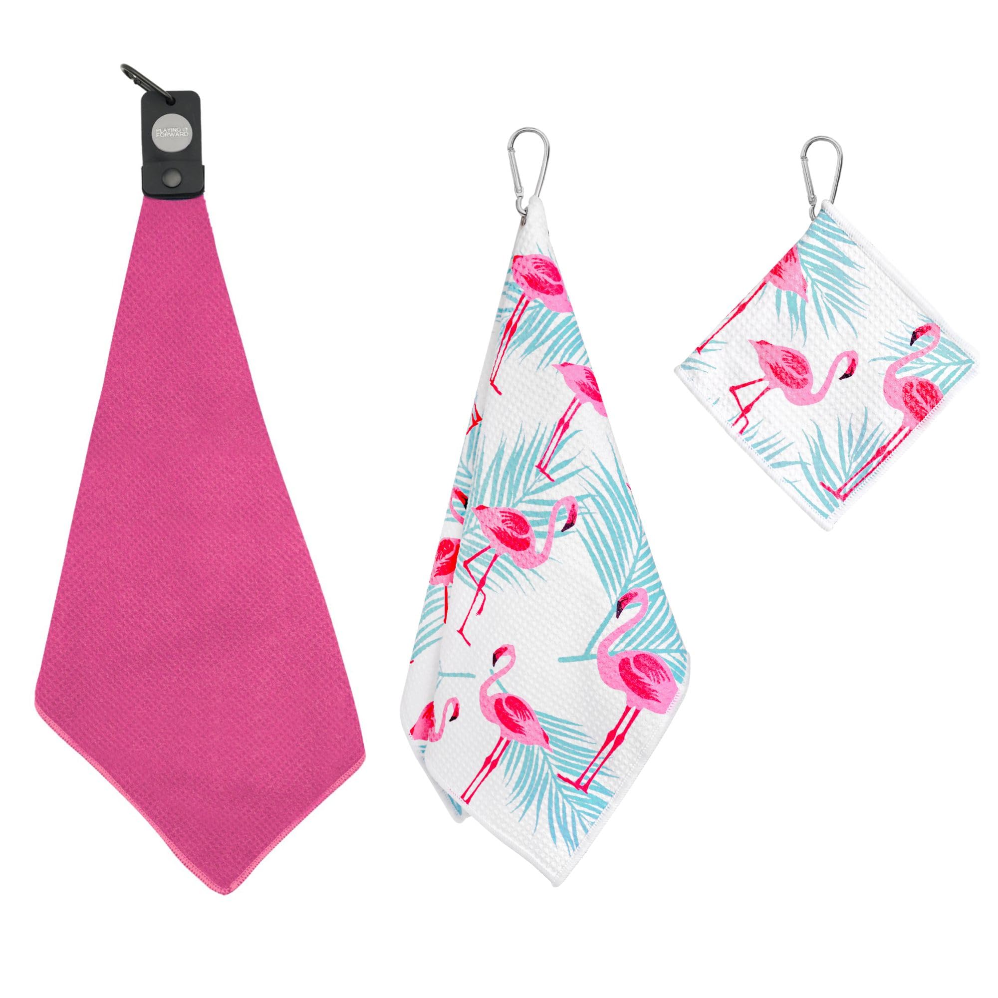 - 🏌️ SET OF 3 GOLF TOWELS WITH CARABINER CLIP: Set Includes 1 oversized 16” x 20” Microfiber Golf Towel with Heavy Duty Removable Carabiner Hook Clip and 1 large golf towel 21”x16” and 1 small 12”x6” golf ball and club cleaner towel. Easy to use - attaches simply to all golf bags, belt loops, golf carts, pull carts, push carts and more. Makes a great gift set for Father’s Day, Mother’s Day, Birthdays, Anniversary’s, Christmas, Valentine’s Day, and all Special Holidays.