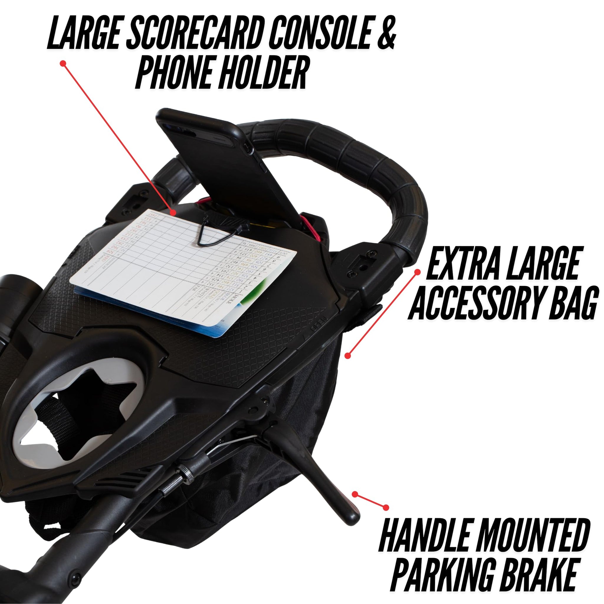- Auto-Open Technology: The Nitron Push Cart features an innovative auto-open mechanism that lets you set up your cart effortlessly, saving you time and energy on the golf course. And in one simple step, the cart folds back down in seconds.
