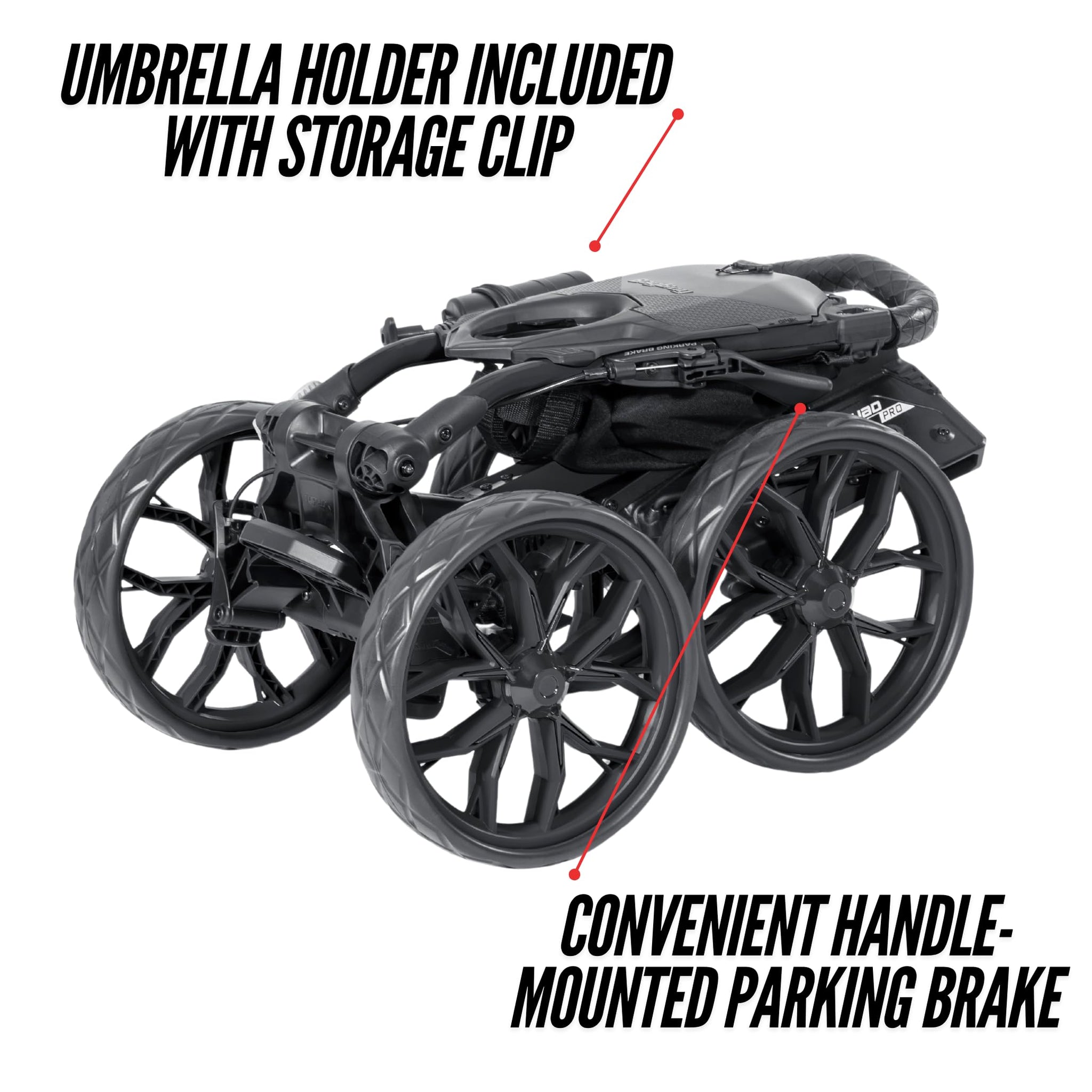 Details: The Quad Pro has been reengineered for ultimate convenience on the course. With a new iron plate mounted on the handle, you can easily keep your magnetic range finder or towel within reach. The refreshed frame gives the cart a more modern, updated look and folds smaller than the previous generation for better storage capabilities.
