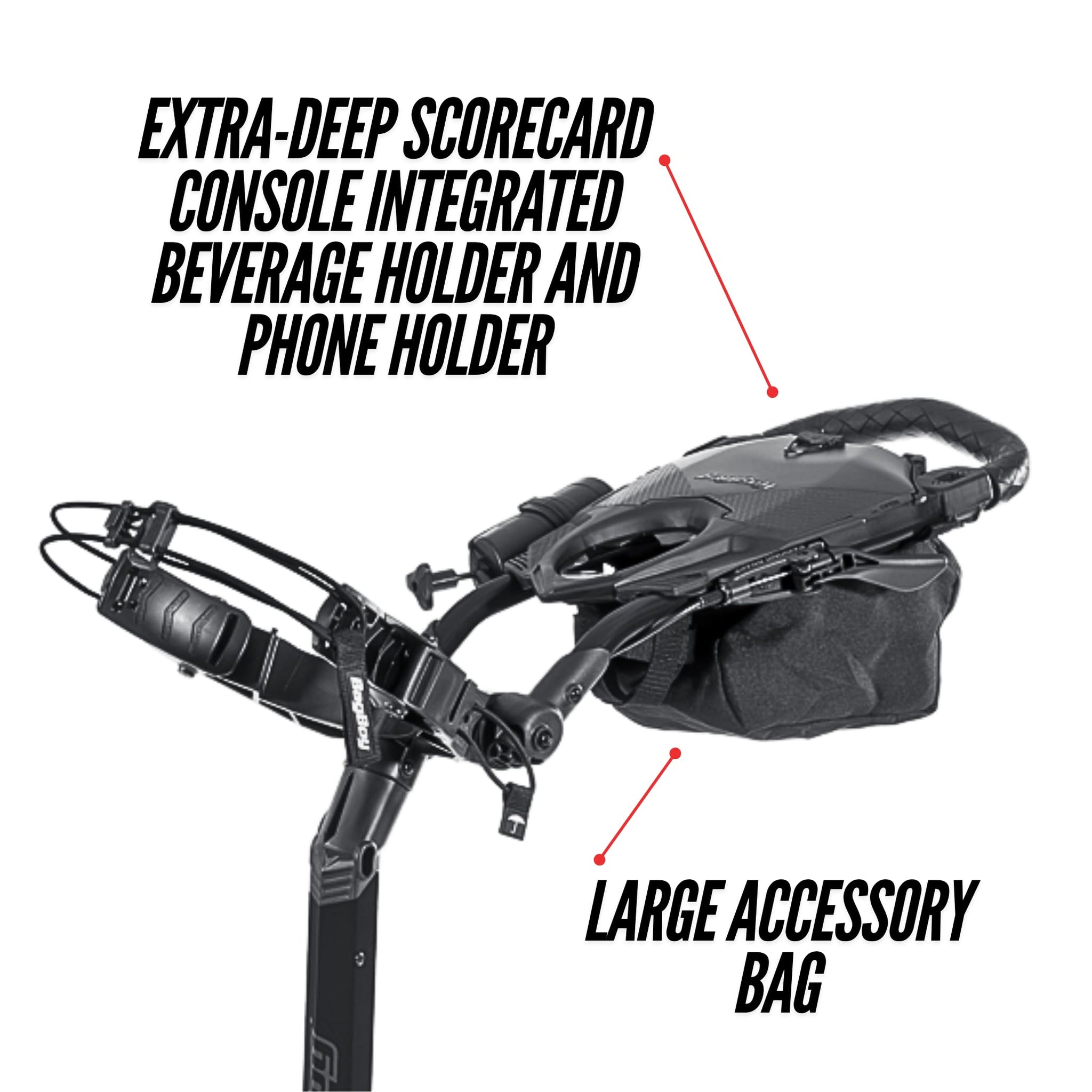 - Generous storage capacity with an extra-deep scorecard console, large accessory bag, integrated beverage holder and phone holder