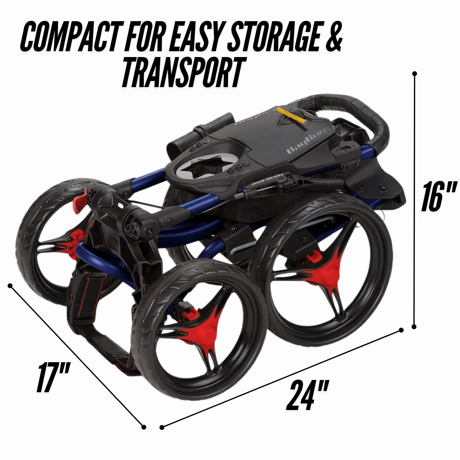 Details: The Disc Golf Quad XL has a sleek aluminum frame, four wheels offer superior stability with 11.5 inch front and 11.5 inch rear wheels. Room for your gear in the full feature, extra deep scorecard console, and extra-large accessory bag. The Quad XL is super compact for storage and transport.