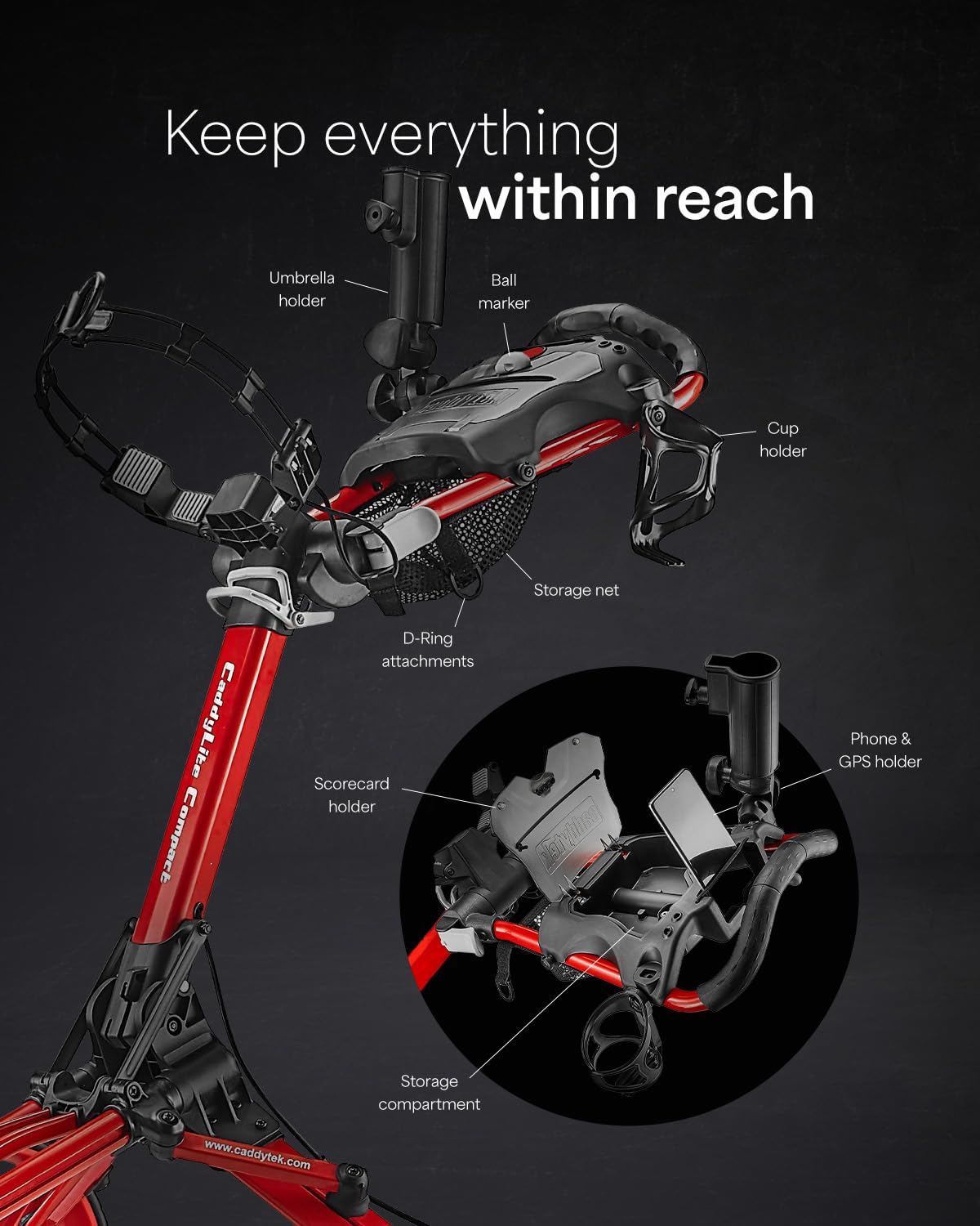 Details: Introducing our Caddytek CaddyLite Compact Golf Pushcart, the pinnacle of convenience and functionality for golf enthusiasts. Engineered with precision and packed with innovative features, this pushcart sets the standard for compactness and performance in the market. With its patented automatic one-click design, transitioning from storage to play has never been easier. Simply fold and unfold in one seamless step, thanks to its intuitive design. Despite its compact folded size of just (16” x 14” x 21”), the CaddyLite Compact unfolds to reveal a spacious 32” wide body design, providing unrivaled stability and ease of steering. Engineered for optimal balance, the wide frame ensures a steady ride across all terrains, while its lightweight construction allows for effortless maneuvering. Navigating any terrain is effortless with the pushcart's 3 large EVA maintenance-free ball bearing wheels, ensuring perfect balance and traction on all surfaces. Plus, the adjustable handle offers multiple pushing positions, allowing you to customize your comfort as you traverse the course. And for added safety, a convenient Hand Brake is included, giving you control on steep inclines or during quick stops. Loaded with features, the CaddyLite Compact boasts a scorecard holder, integrated beverage holder, storage compartment, umbrella holder, Cell Phone/GPS holder, and mesh net, keeping all your accessories organized and within reach. The patented upper bag holder securely accommodates most stand bags as well as golf cart bags in varying sizes and shapes, providing peace of mind during transport. Constructed with a lightweight aluminum frame weighing only 18 lbs, this pushcart strikes the perfect balance between durability and portability. Rain or shine, you can trust the CaddyLite Compact to get your clubs around the green in style and convenience. Elevate your golfing experience with the Caddytek CaddyLite Compact Golf Pushcart and enjoy the game like never before!
