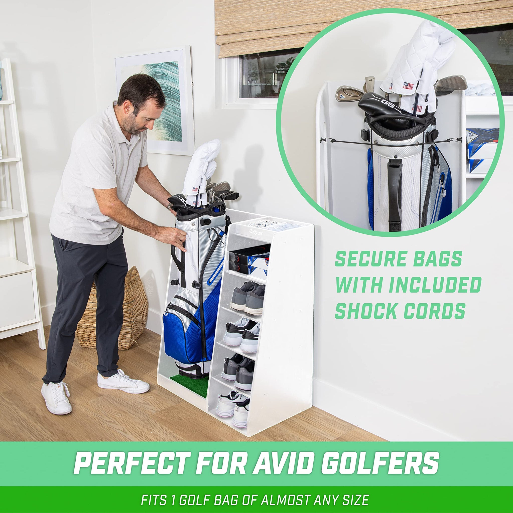 • NEAT ORGANIZATION: Universal design holds 1 golf bag of nearly any size with an optional safety cord to keep it secured; Shelves can hold 4-5 pairs of golf shoes (virtually any size) with room for accessories like balls, tees, towels, etc