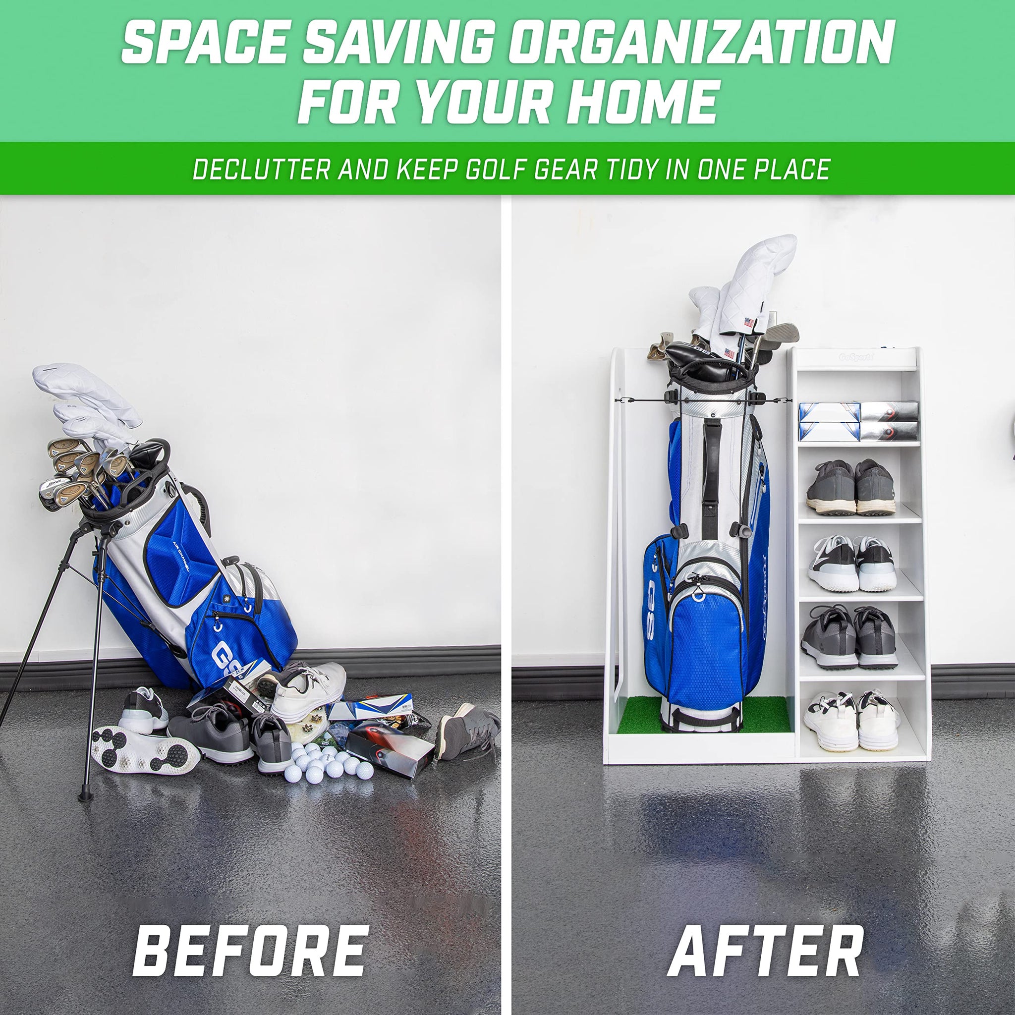 Details: Keep your golf equipment and accessories looking neat and professional! The GoSports Premium Wooden Golf Organizer is a stylish space-saving solution for neatly storing golf equipment while keeping it on hand. The premium build features sturdy wood construction and is painted white for a clean look that complements any home, office, garage and more. Don't settle for flimsy metal wire storage racks! Upgrade with multiple heavy-duty storage compartments (golf bag compartment, 5 shelves) with enough space to store virtually of your equipment. Rounded edges protect your equipment from snagging, scratching and tears. The organizer includes illustrated step-by-step instructions for easy assembly; assembled size measures 17 L x 29 W x 37 H inches. The golf bag compartment measures 16 L x 16 W x 36 H inches. The shelves measure 11 W x 6.5 H and range from 11 inches deep to 16 inches deep. Store and display your golf equipment with pride with the GoSports Premium Wooden Golf Organizer!.
