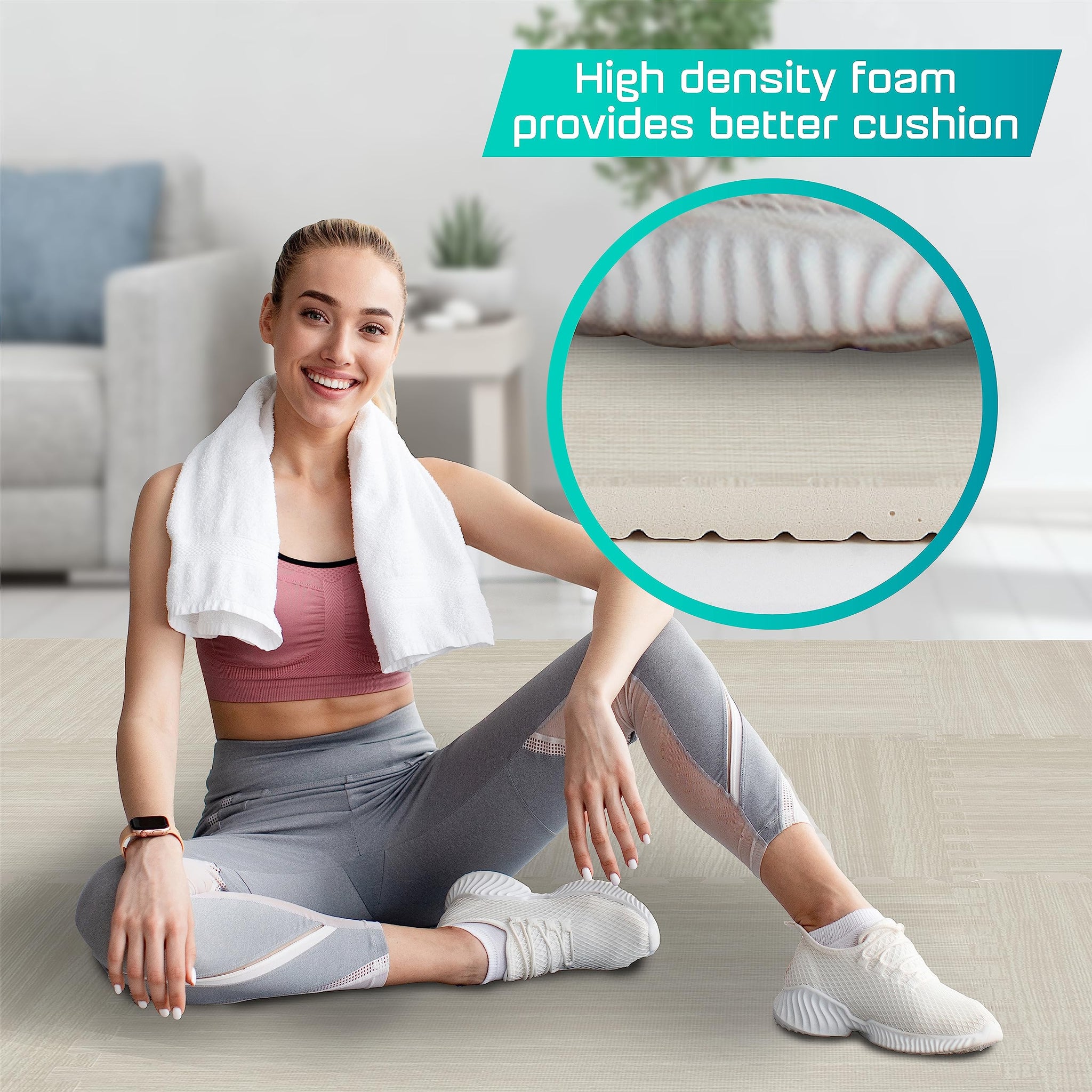 • DURABLE & NON SLIP: The non-skid textured & shock-absorbing surface provides a soft feeling when exercising on, best for comfortable workout area – a combination of high-density EVA foam mat & exercise mat for excellent support and cushion