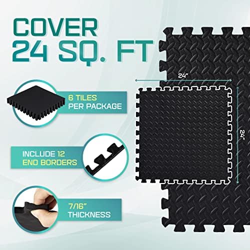 Yes4All interlocking Exercise Foam floor mats, for Gym Equipment – Eva Tiles (24 Square Feet – Black – 6 pcs)