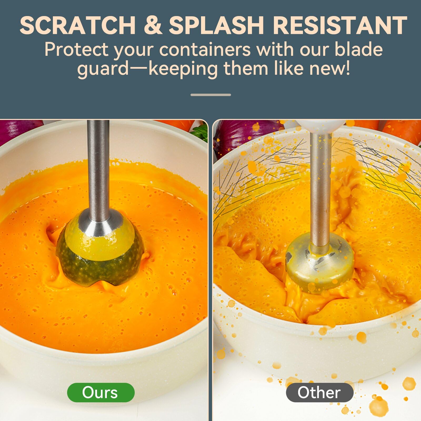 - 2024 ULTIMATE COMBINATION: The 7-in-1 immersion blender set comes with 2 blades (Stainless Steel 4-Leaf Blade and ice crusher blade), and features unique bell guard that safeguards non-stick cookware from scratches and reduce suction, prevents food splatters, Emulsions blender also includes 500 ml chopper, 20oz measuring cup, whisk, milk frother, accessories holder, and 5 ft. power cord.