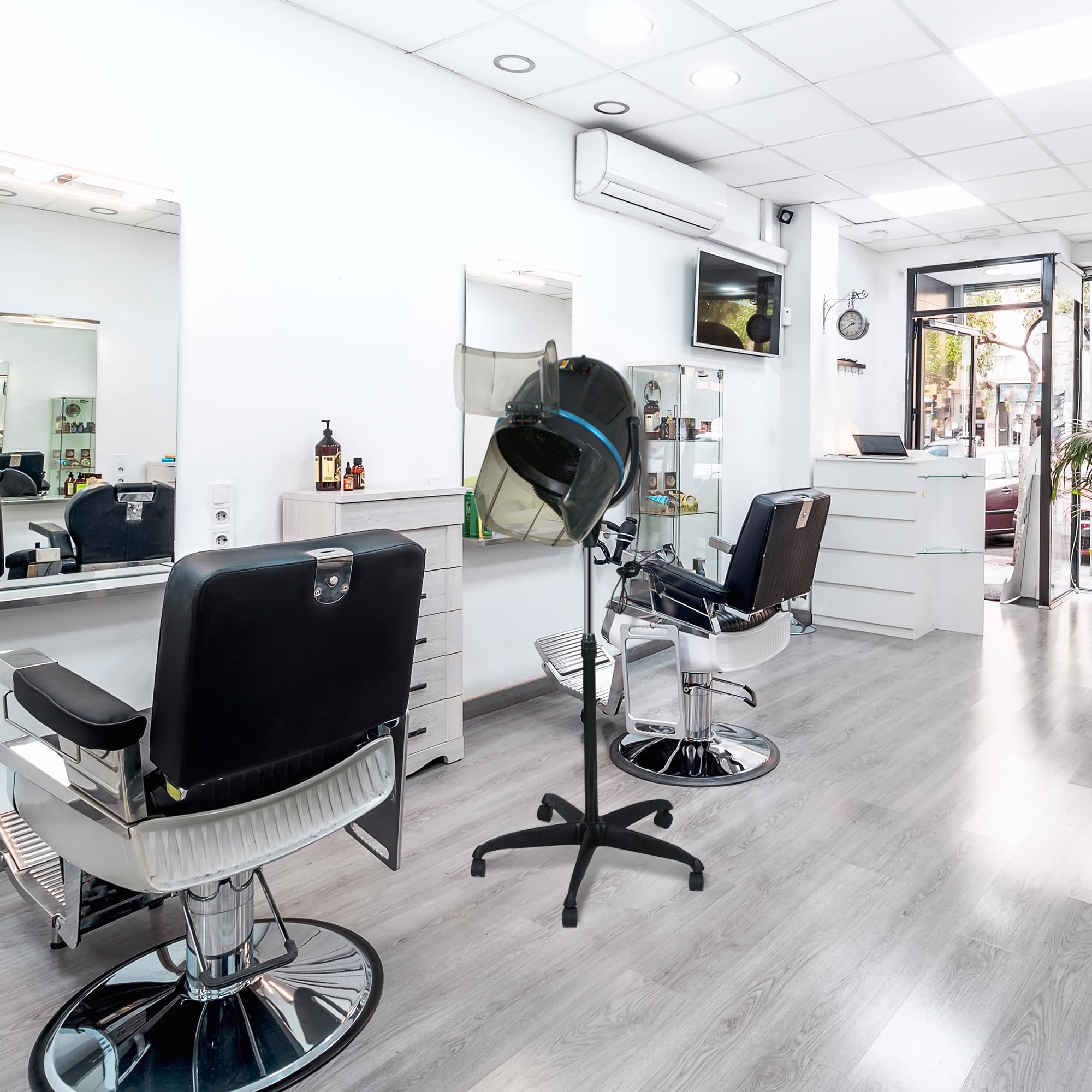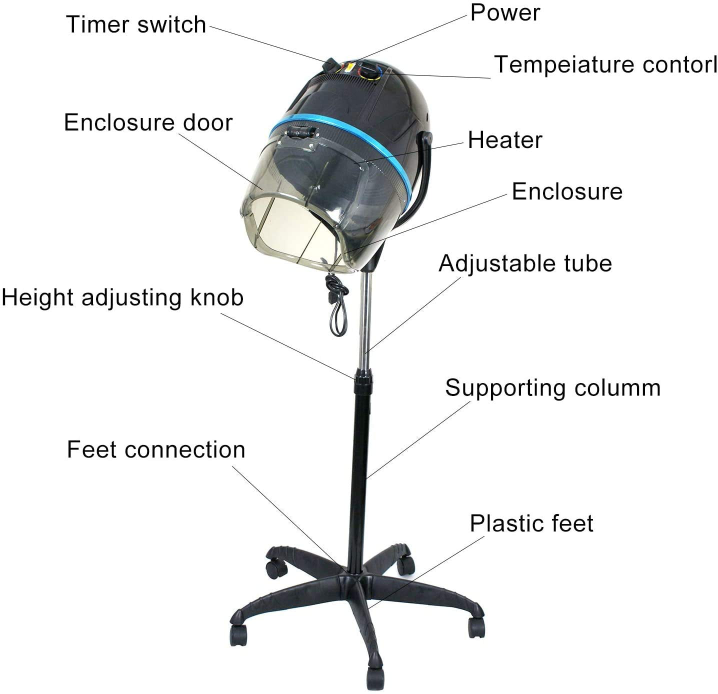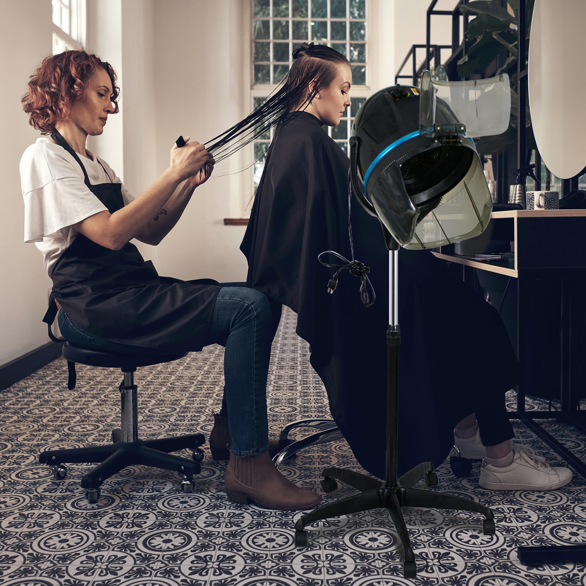 Elevate your hair styling experience with our Professional Height Adjustable Hair Dryer. This hooded floor-standing bonnet hair dryer is specifically designed for use in beauty salons, spas, or even at home. The sleek black design adds a touch of elegance to any space. The rolling base with wheels allows for easy mobility, making it convenient for use wherever you need it. Say goodbye to traditional handheld dryers and step up your game with this stand-up hair dryer.
