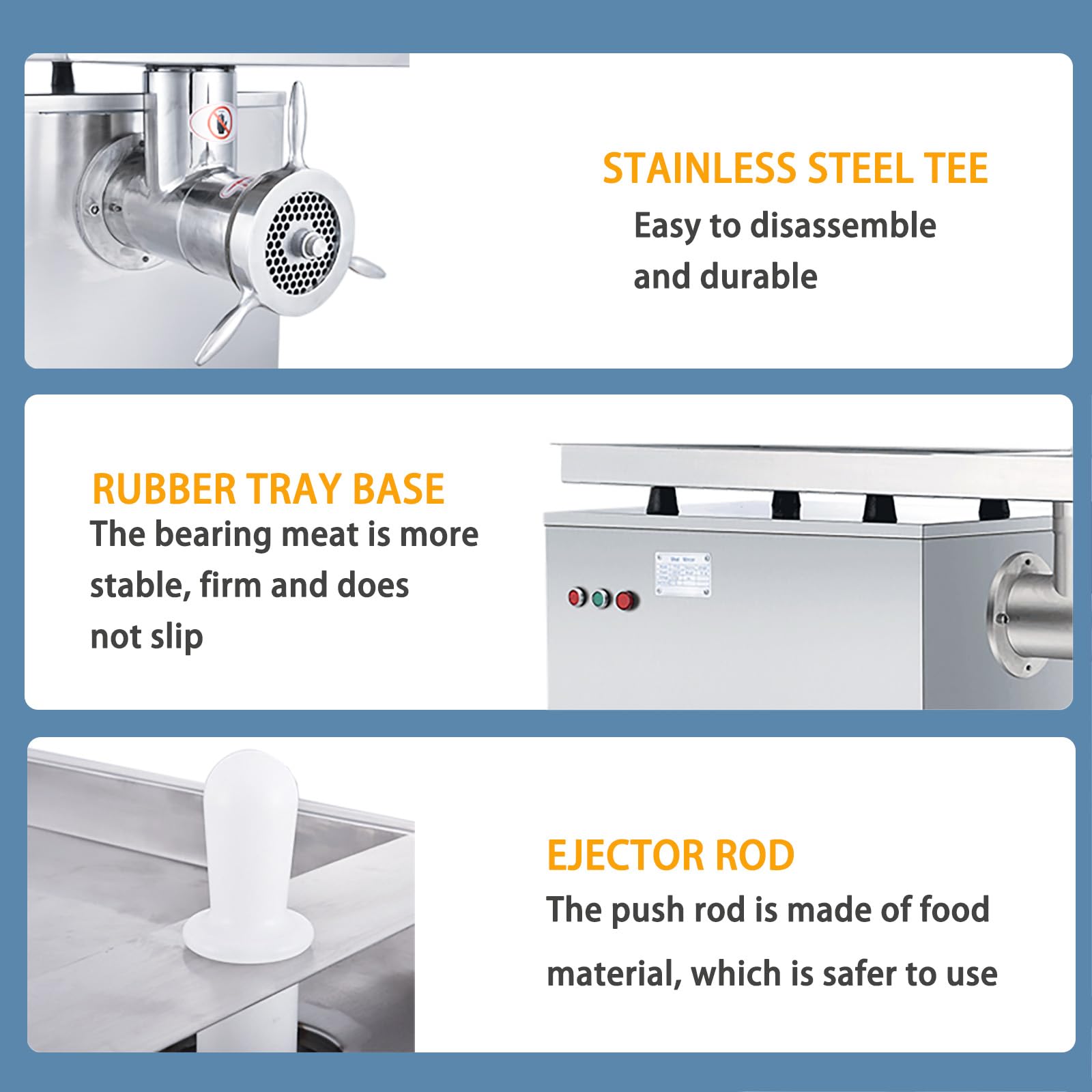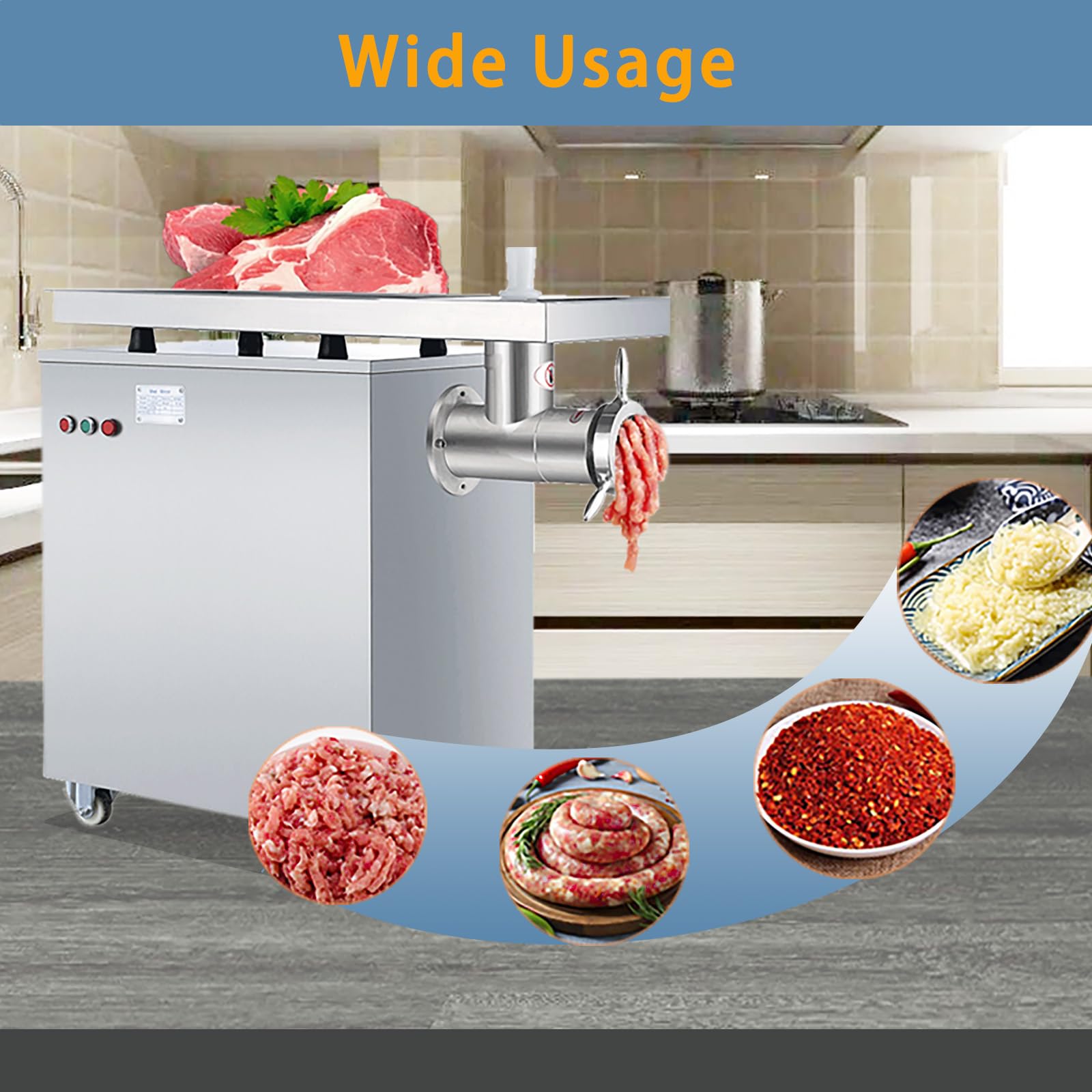 • Wide Applications: The commercial meat grinder effortlessly handles challenging meat processing tasks, from tender poultry to hearty beef chunks, and even daily processing of garlic, pepper, ginger juice. It can be used in various settings such as kitchens, restaurants, food processing plants, and corporate settings.