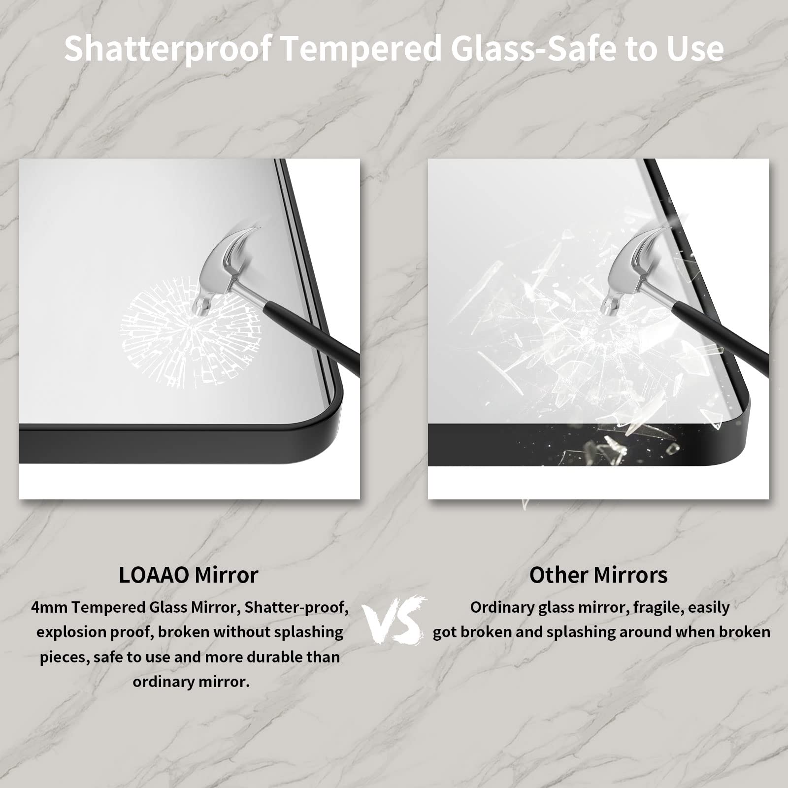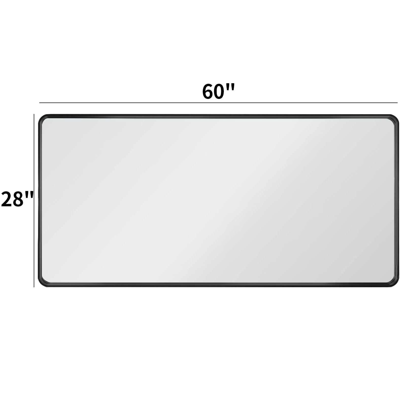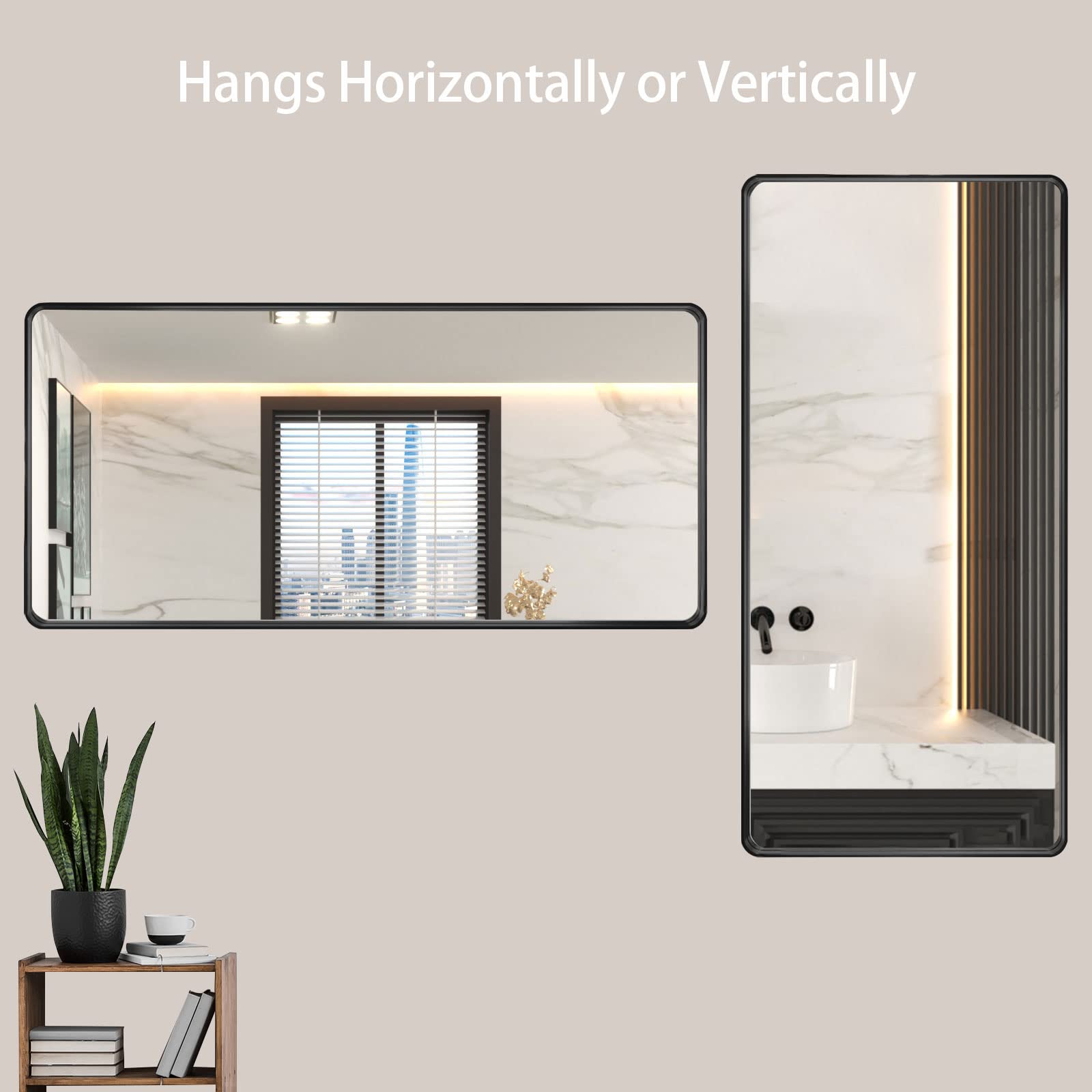 Transform your bathroom into a stylish sanctuary with our LOAAO 60X28 Inch Black Metal Framed Bathroom Mirror for Wall. The matte black finish adds a modern farmhouse touch to any space. This large rounded rectangle mirror is both practical and visually appealing. Crafted with anti-rust tempered glass, this mirror is durable and long-lasting. Hang it horizontally or vertically to fit your space perfectly.