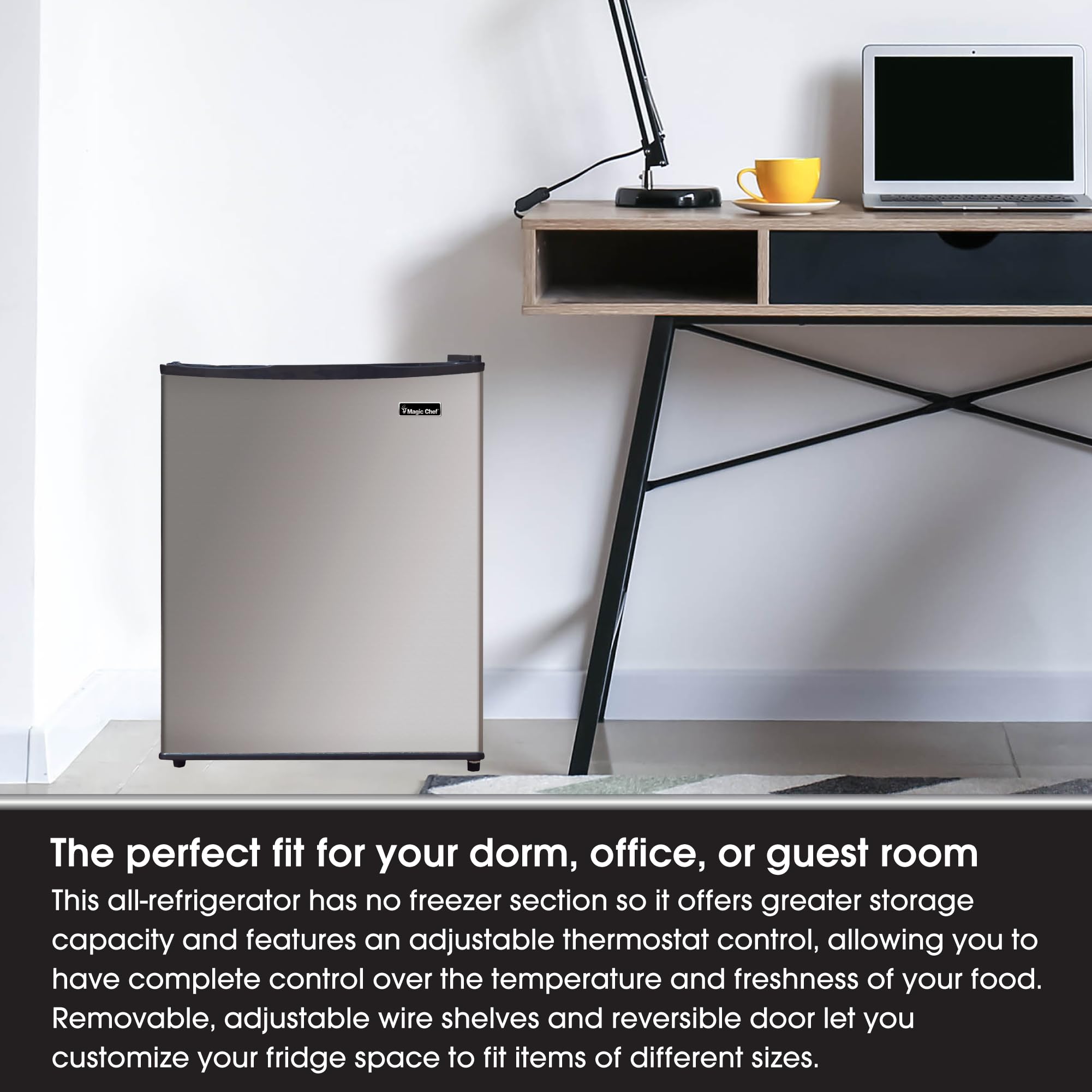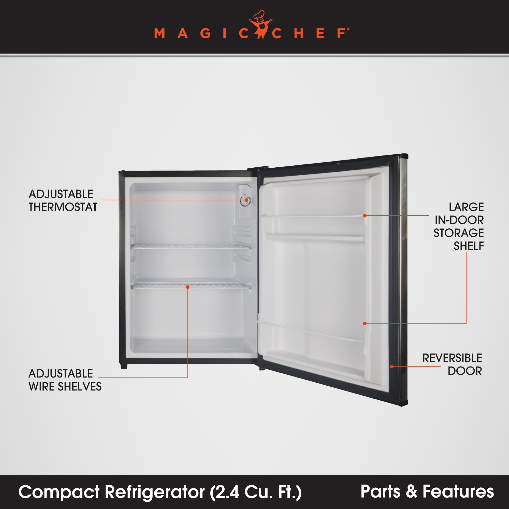 Details: The Magic Chef Energy Star 2.4 cu. ft. mini all-refrigerator has the fresh-food storage options you're looking for whether you're college-bound or simply want a little extra refrigerator space in your home or office. Offering plenty of additional space for storing your favorite beverages and refrigerated snacks, this unit has two removable wire shelves and generous in-door storage to keep you organized. Plus, the reversible door and flush-back design provides additional flexibility in placement.