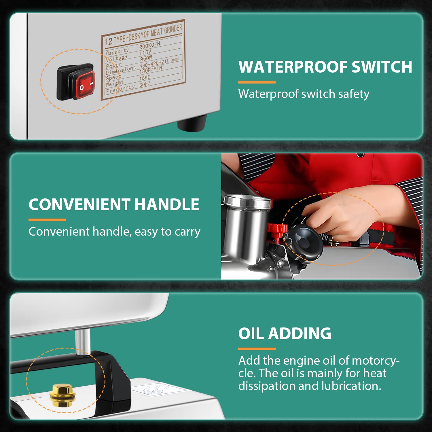 • HIGH EFFICIENCY---The commercial meat Mincer is equipped with 950W powerful copper motor, faster heat dissipation and stable performance. Its efficiency can reach 370lb/h, saving a lot effort for your jobs and housework. With special thread design, the efficiency is 30% higher than that of ordinary thread.The auger adopts a low-speed rotation process to maintain the texture of the meat and lock the nutrition of the meat.