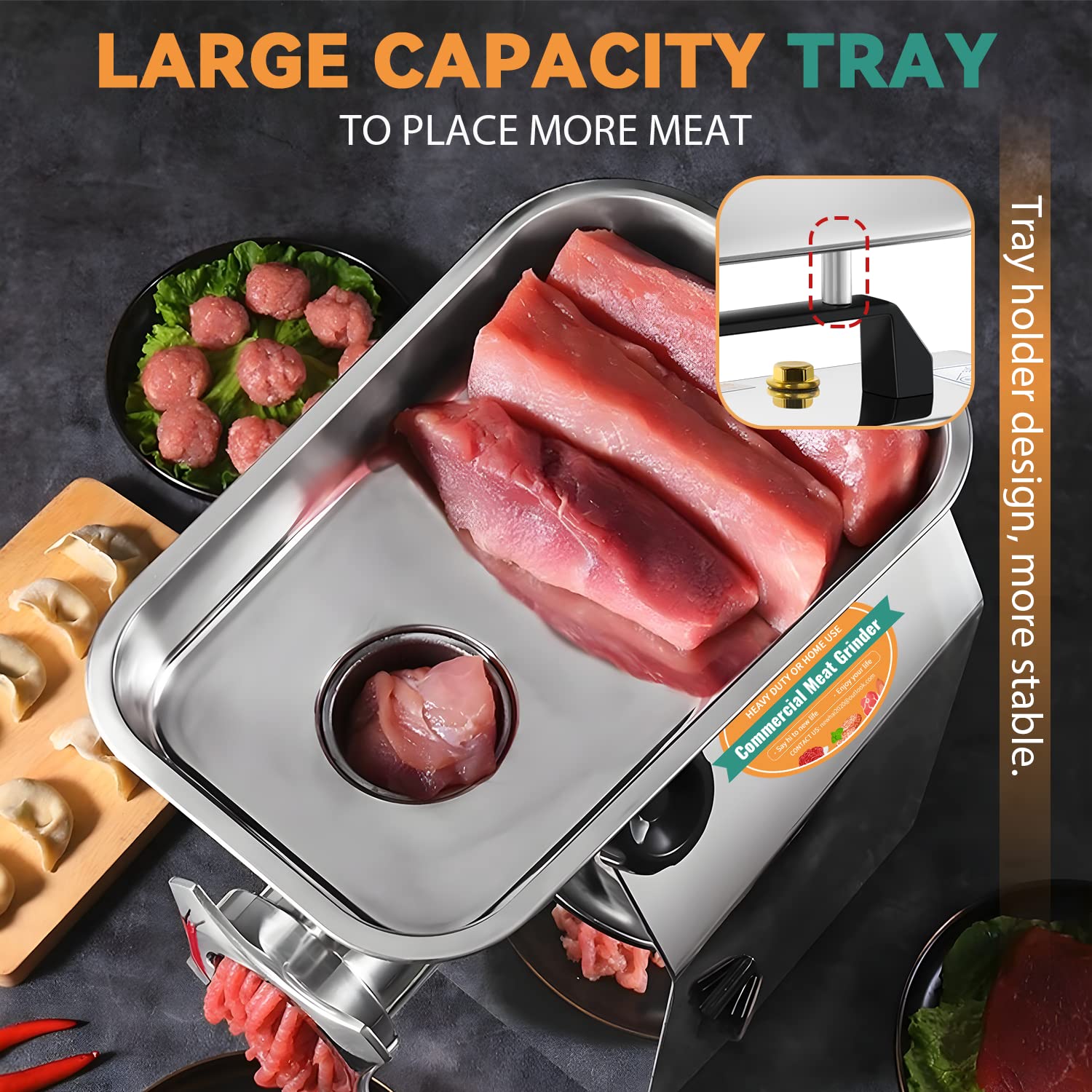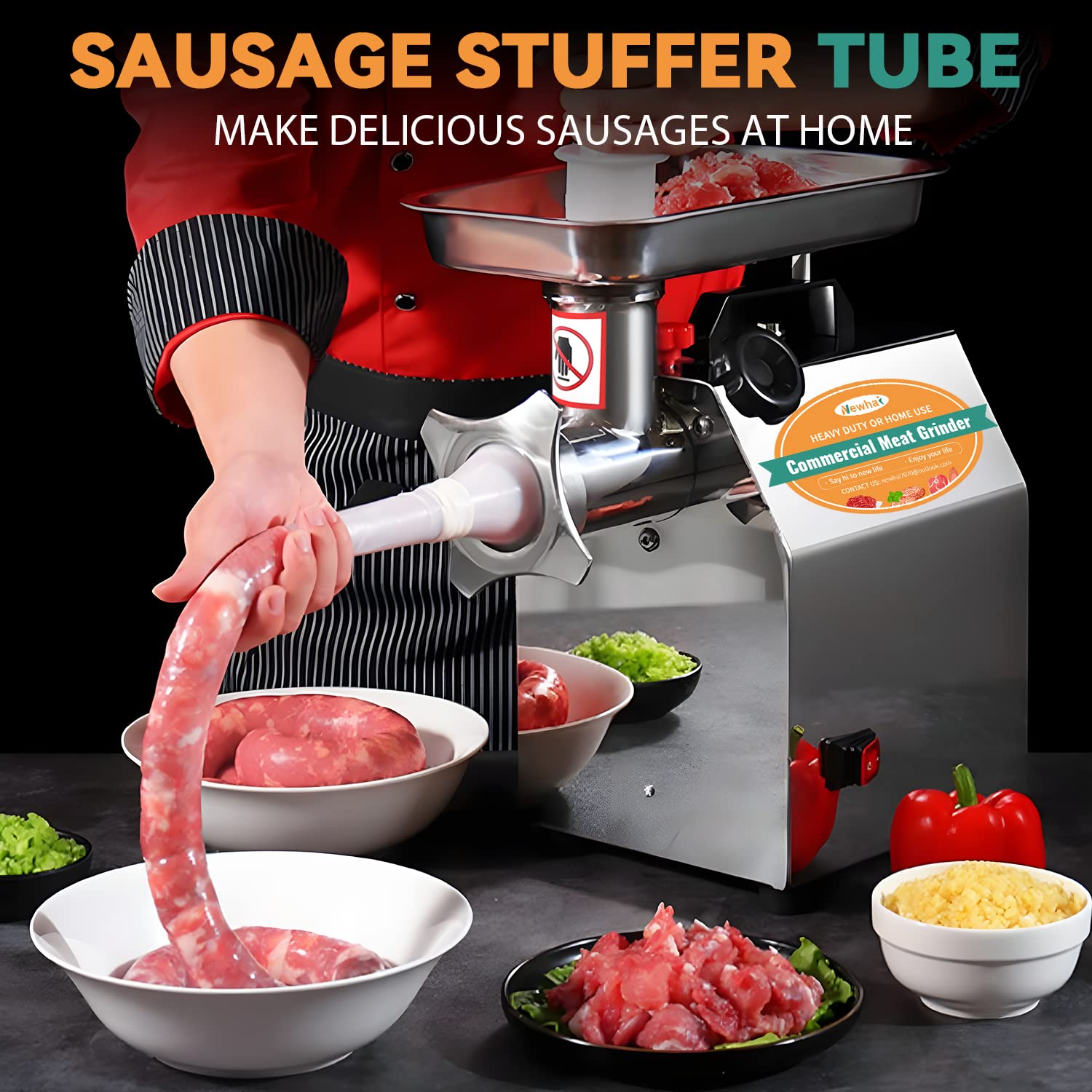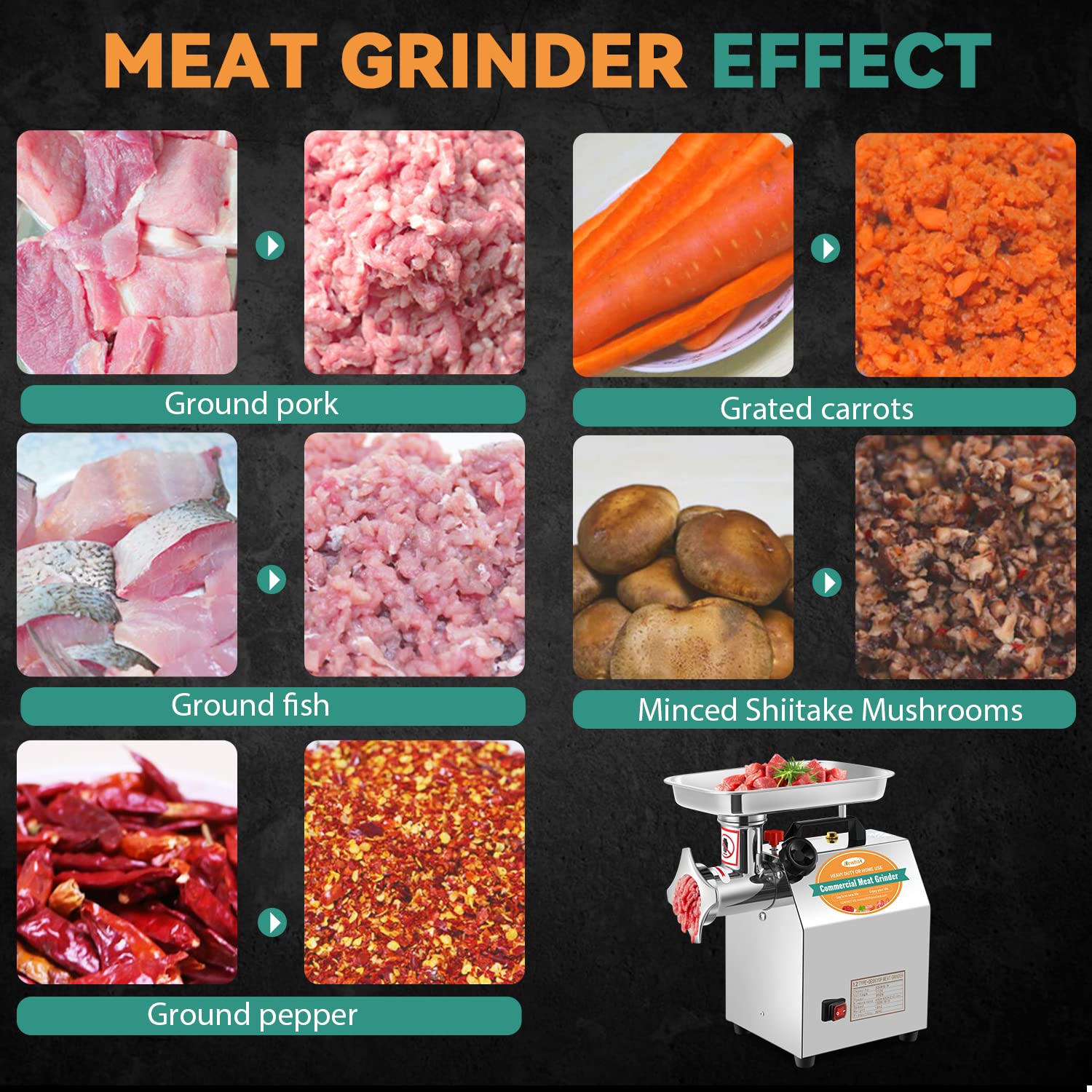 • DESIGNED FOR CHICKEN BONES---The industrial meat grinding machine is perfect for ground meat such as ground pork, ground shrimp, and then to make meatballs for babies and the old. This grinder is also good for grinding some soft bones, like chicken bones and fish bones. The meat grinder is also good for grinding vegetables, like carrots, mushrooms, chili, garlic, etc and making empanadas and dumplings, which can be used in small restaurants.