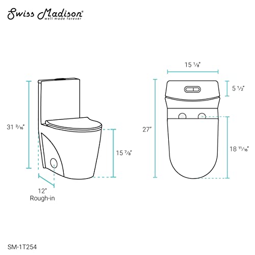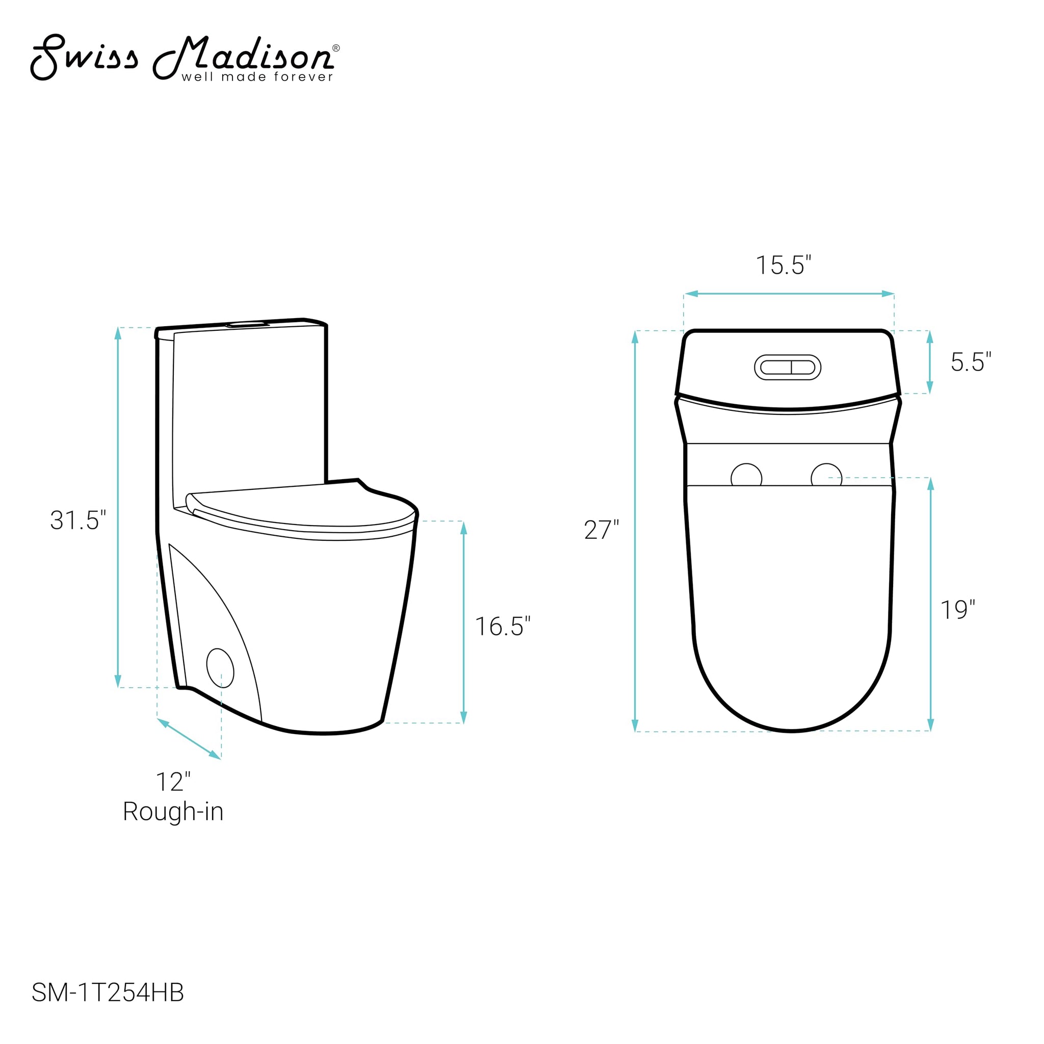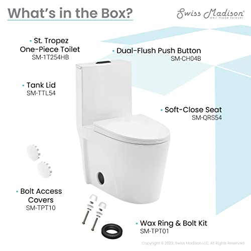 Introducing the Swiss Madison Well Made Forever SM-1T254HB St. Tropez One Piece Elongated Toilet with Dual Vortex Flush and sleek Black Hardware. This modern and stylish toilet is not only aesthetically pleasing, but also built to last a lifetime. Say goodbye to constant repairs and upgrades as this premium Swiss Madison toilet is designed for durability and reliability. Upgrade your bathroom with the best - Swiss Madison Well Made Forever.