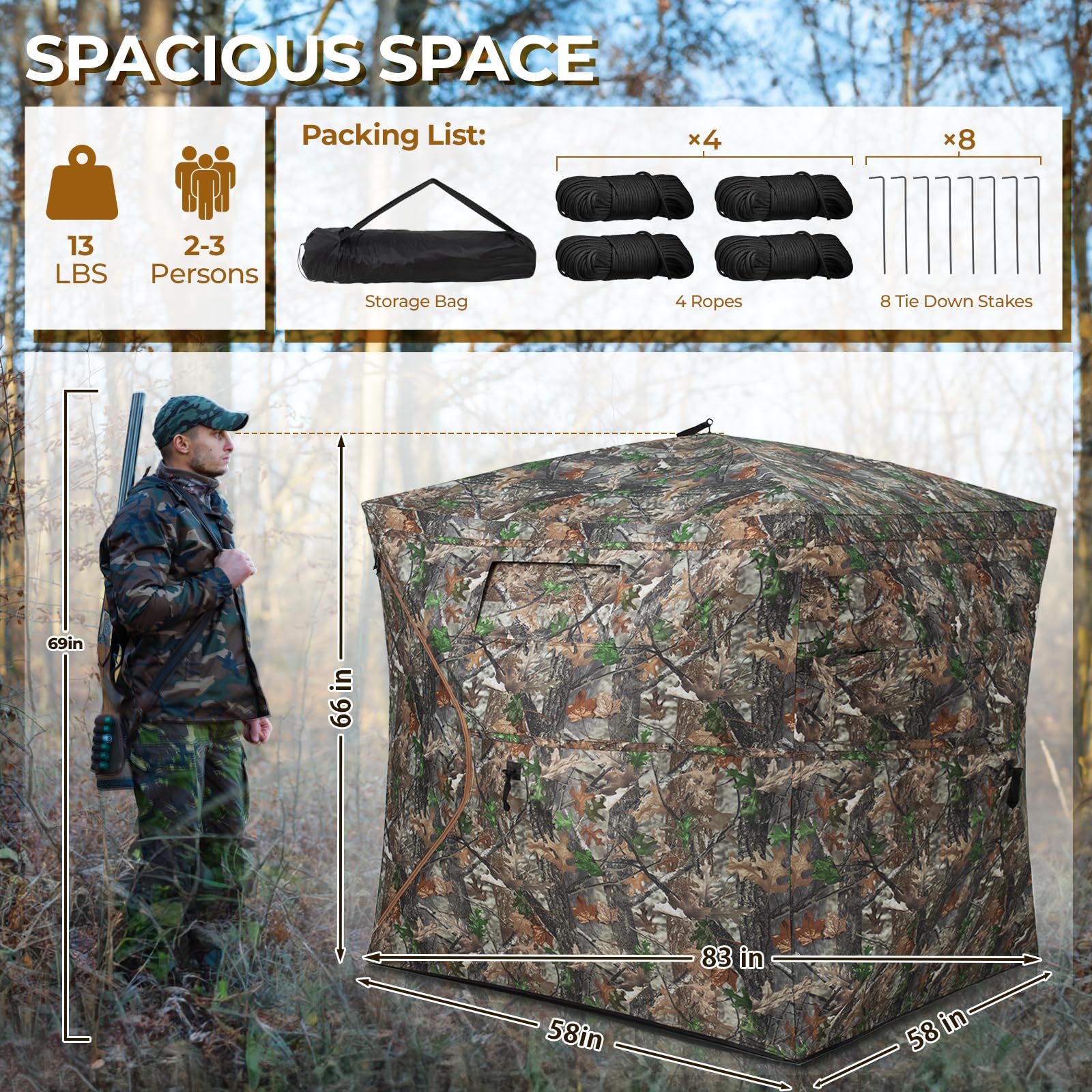 - 【SPACIOUS & LIGHTWEIGHT】With the dimensions of 65”height, hub to hub 75" x 75", and a floor space of 55" x 55",HUNTSEN hunting blind provides plenty of room for 2-3 persons, ideal for hunting, giving you more leg room and floor space for your gear like hunting chairs.