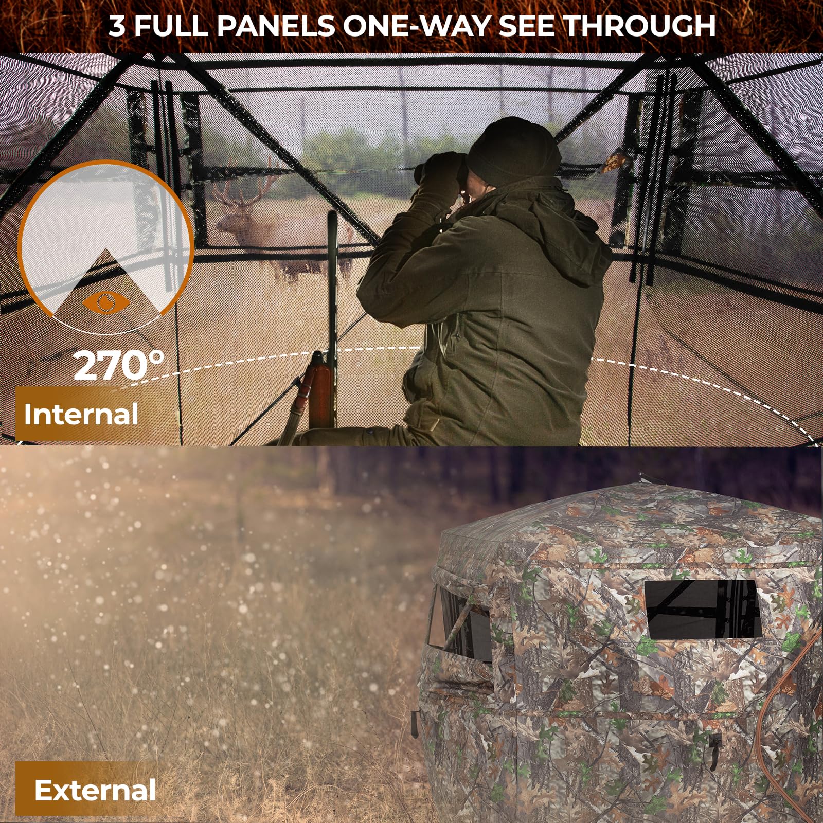 - 【SILENT & CAMOUFLAGED】HUNTSEN's hunting ground blinds features 3 slient- sliding windows on each side, ensuring hunters remain undetected. The realistic camo pattern and brushed-in loops seamlessly blend the deer blind with the surrounding habitat for enhanced concealment to perfect camouflage.