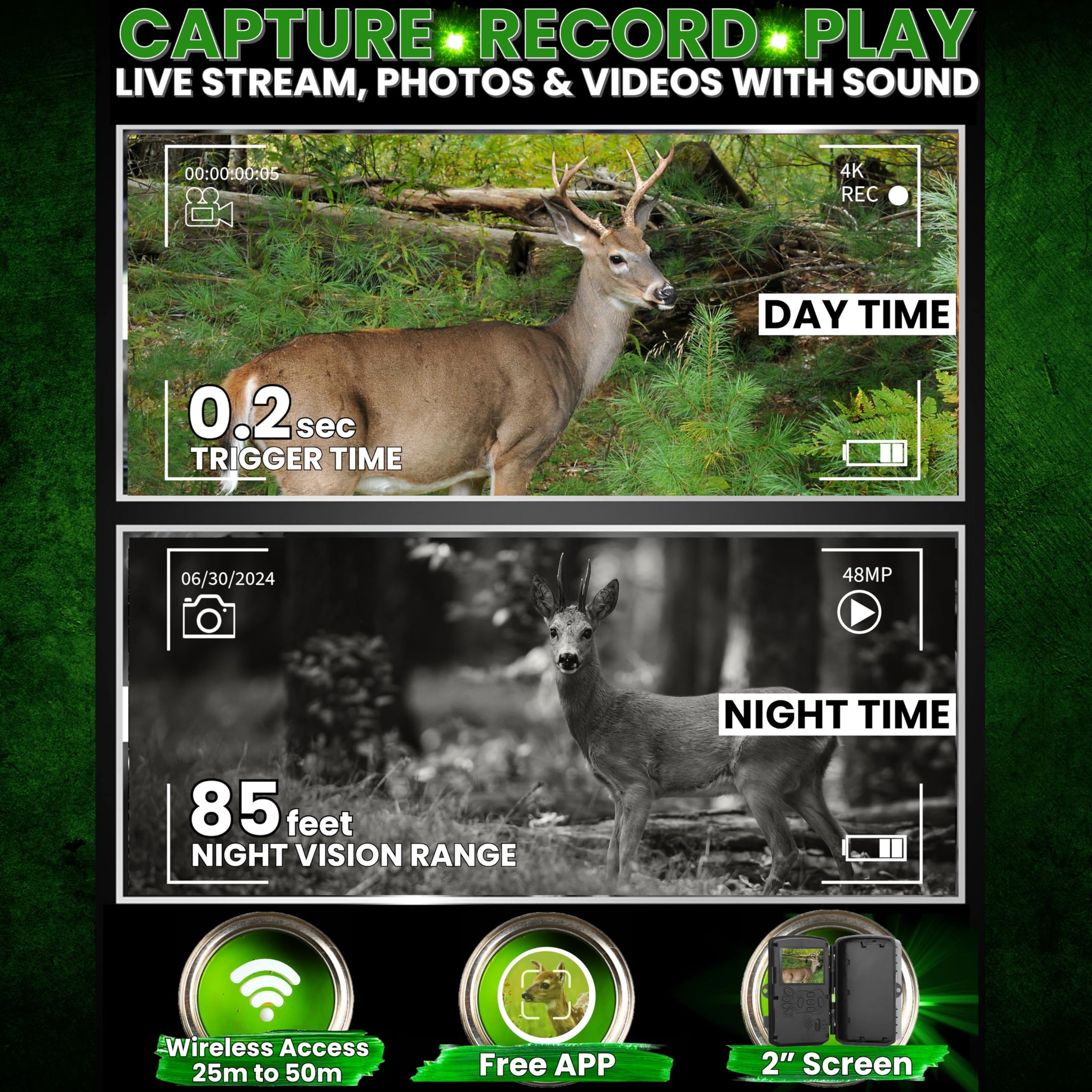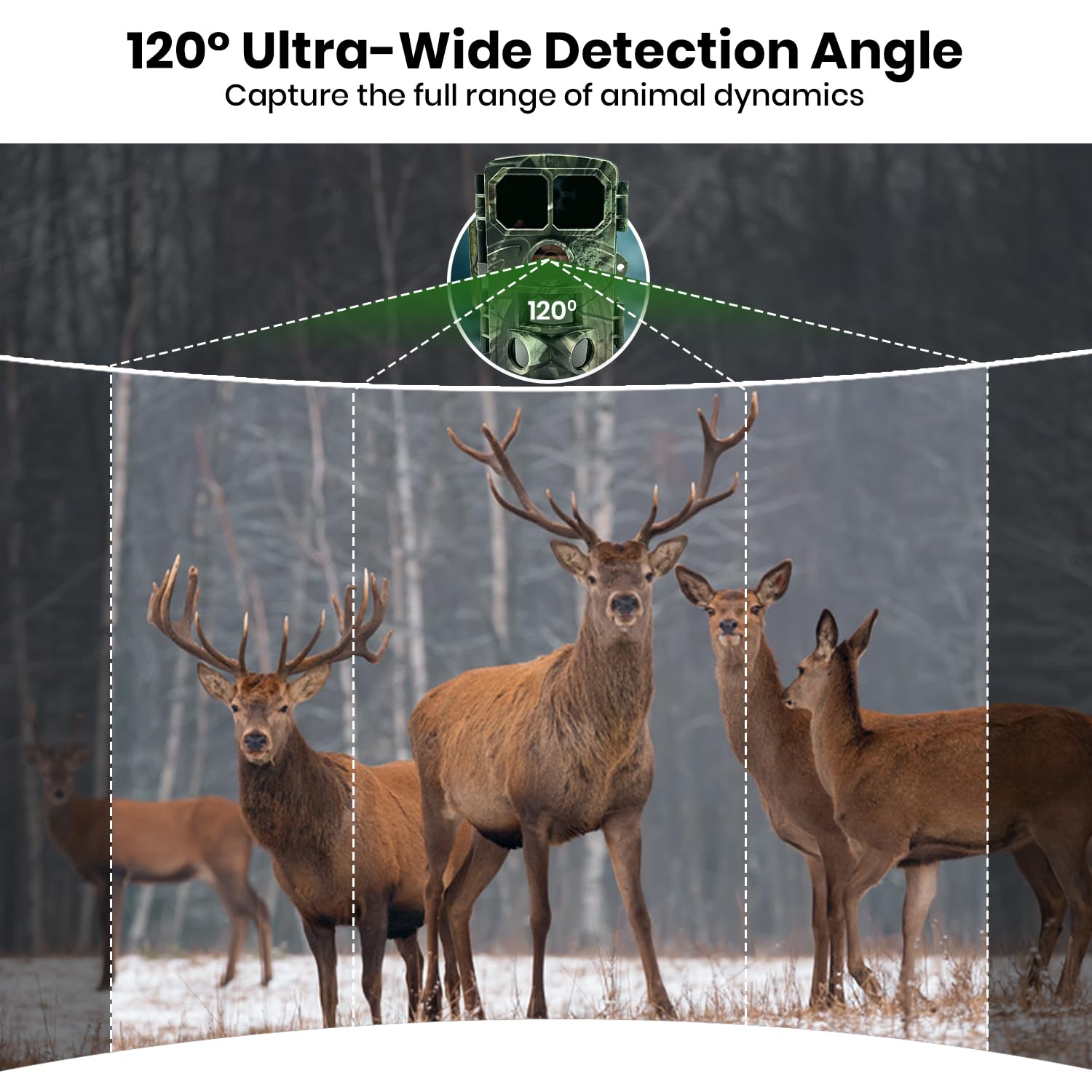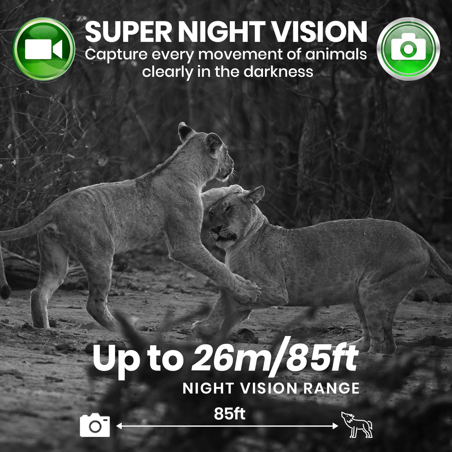- [Why It's Essential] Choose our critter camera for backyards with WiFi trail camera for its superior features, including a wide-angle lens, powerful IR LEDs triggering Night Vision motion up to 85ft, and reliable wireless programming connectivity within Bluetooth range, which deliver clear, detailed images & videos day and night