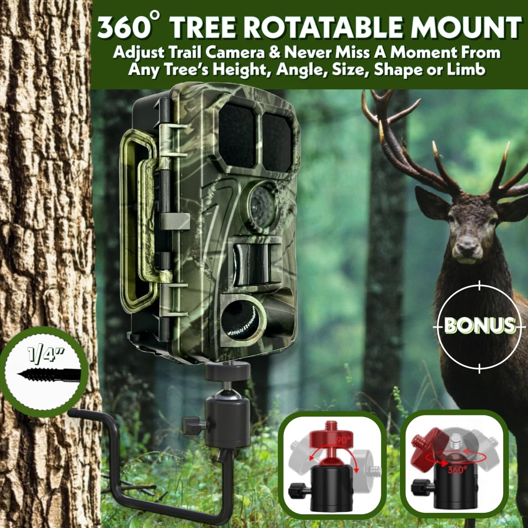 - [Package Includes] Hunting Camera includes 8 AA batteries for extended power and long-lasting performance, along with a 360 Degree rotatable universal trail camera with screw mount, trail camera straps strip for secure tree attachment, 64GB memory card for ample storage, and USB cable for easy data transfer to PC.