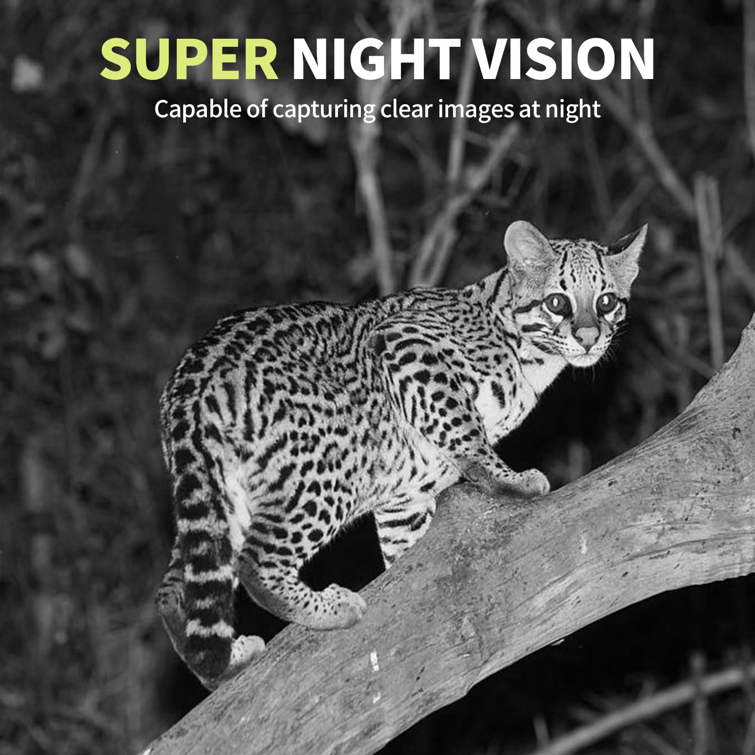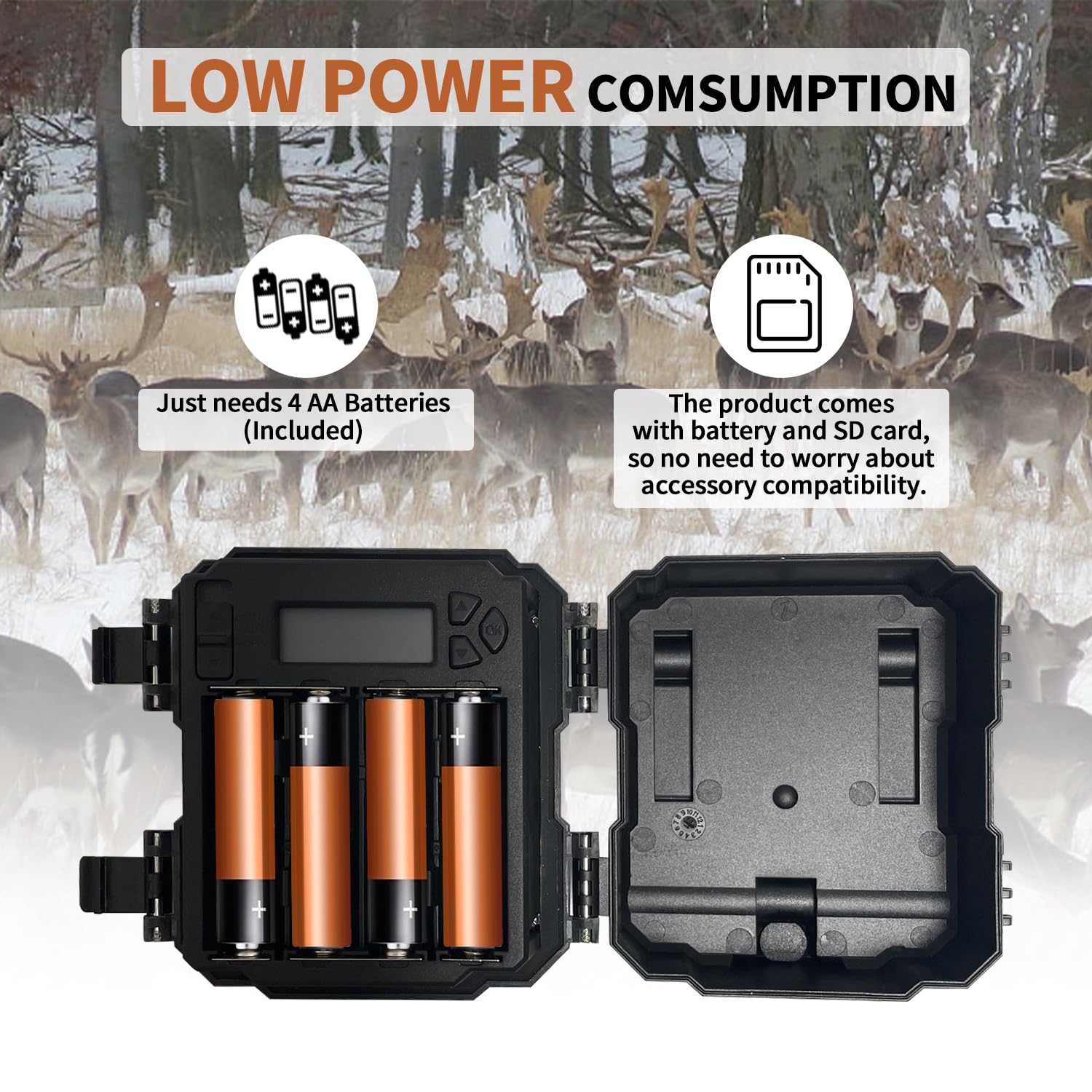 • Low power consumption: The deer camera with night vision only need 4 AA batteries, with such a compact design, it boasts a sleek appearance and offers extended standby time under the same conditions, without the need for frequent battery replacements.