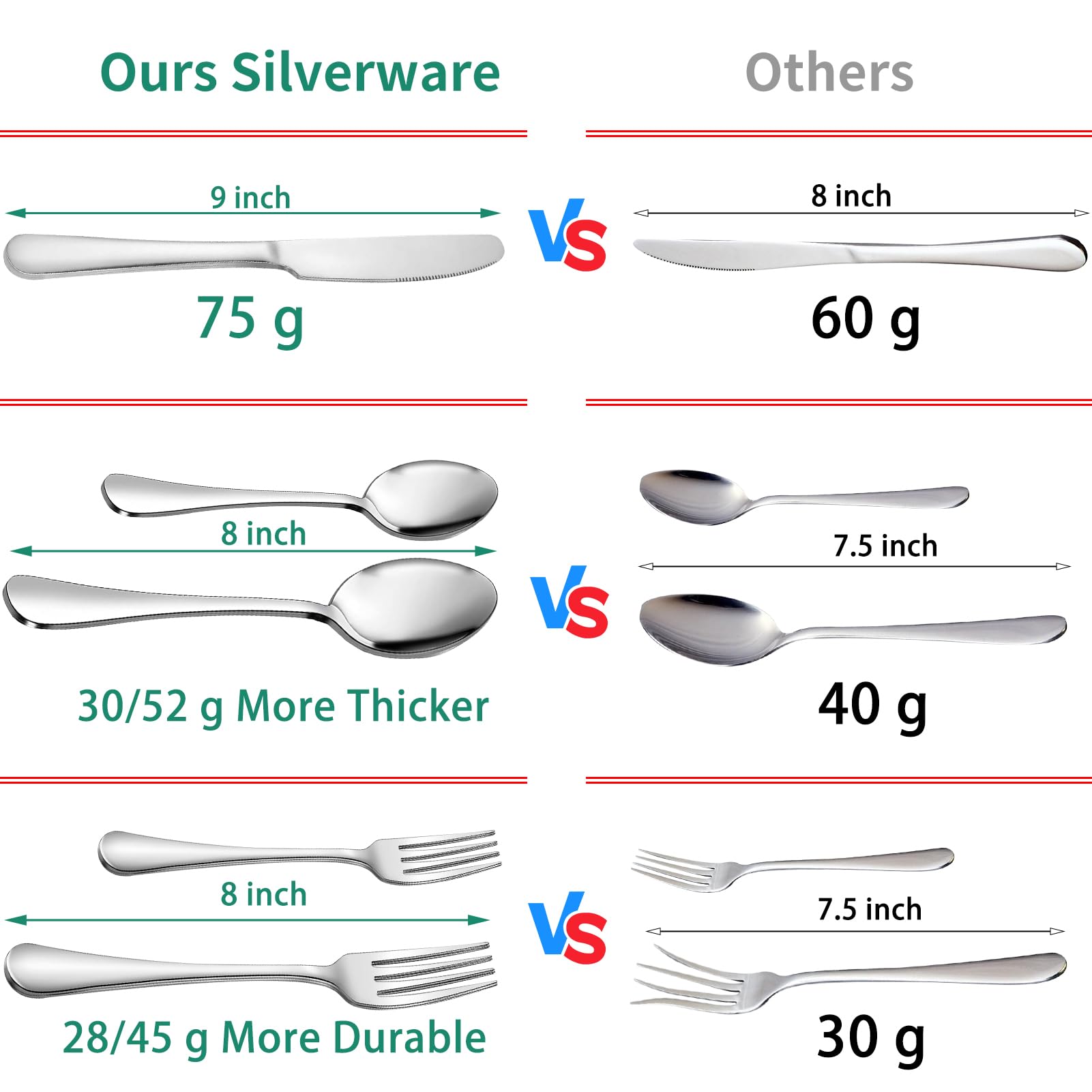 - SILVERWARE SET FOR 8: This 49PCS silver flatware set with silverware organizer includes 8 of each: Dinner Spoon, Teaspoon, Dinner Fork, Dessert Fork, Dinner Knife, Steak Knife, Plus 1 plastic non-slip flatware organizer to sort your cutlery. The Silverware tray has six cells of different sizes, matching all kinds of tableware.
